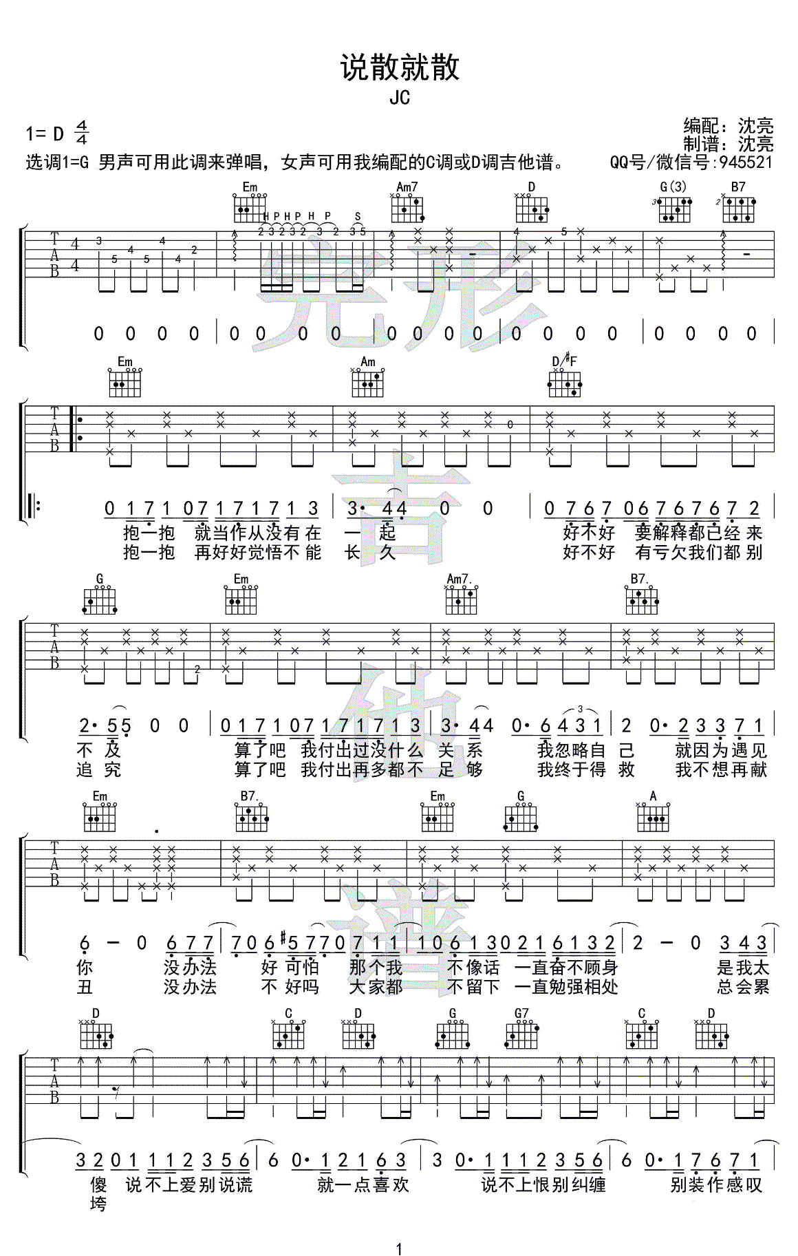 吉他JC《说散就散》吉他谱 - 完整版
