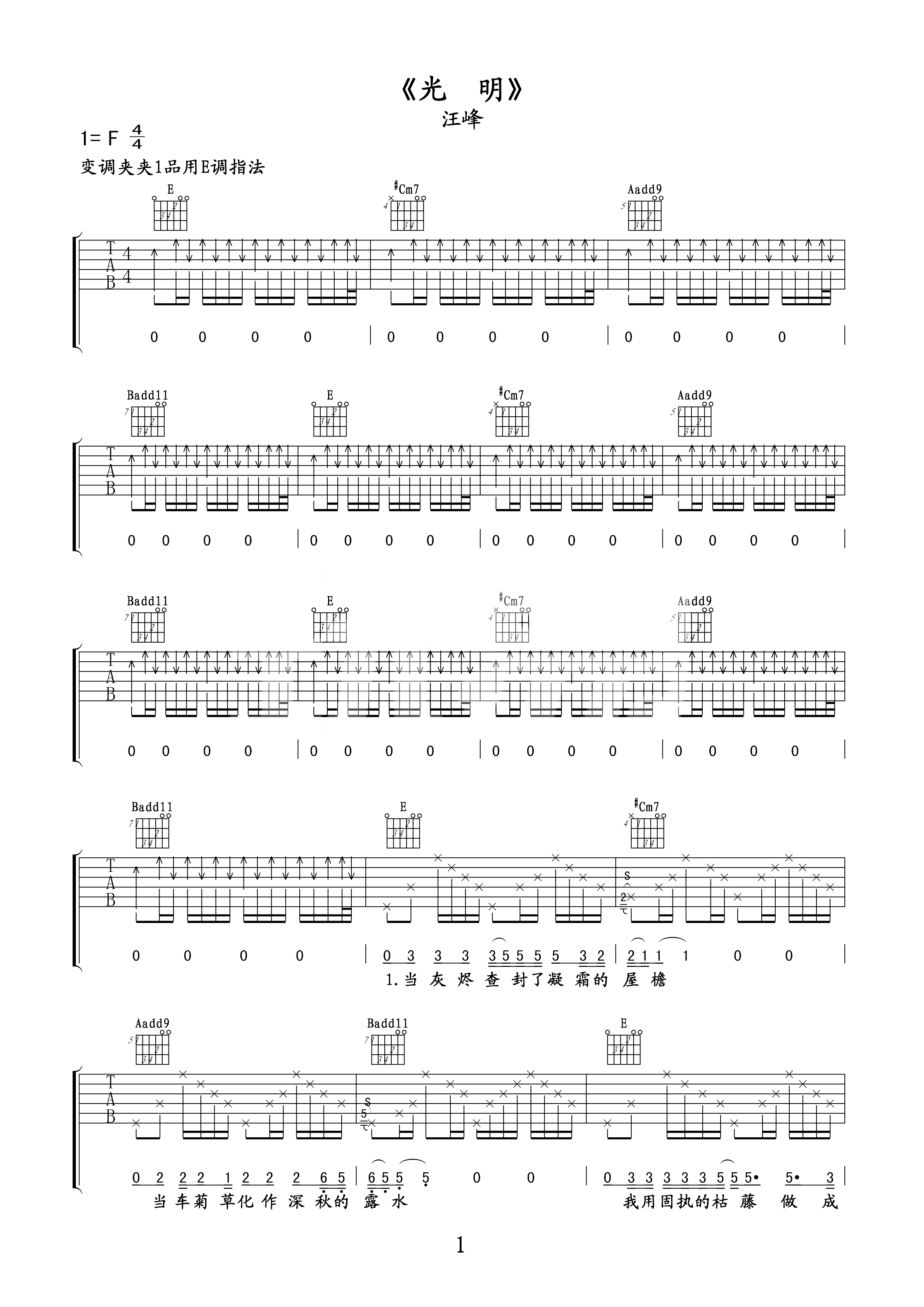 吉他汪峰《光明》吉他谱 - 完整版