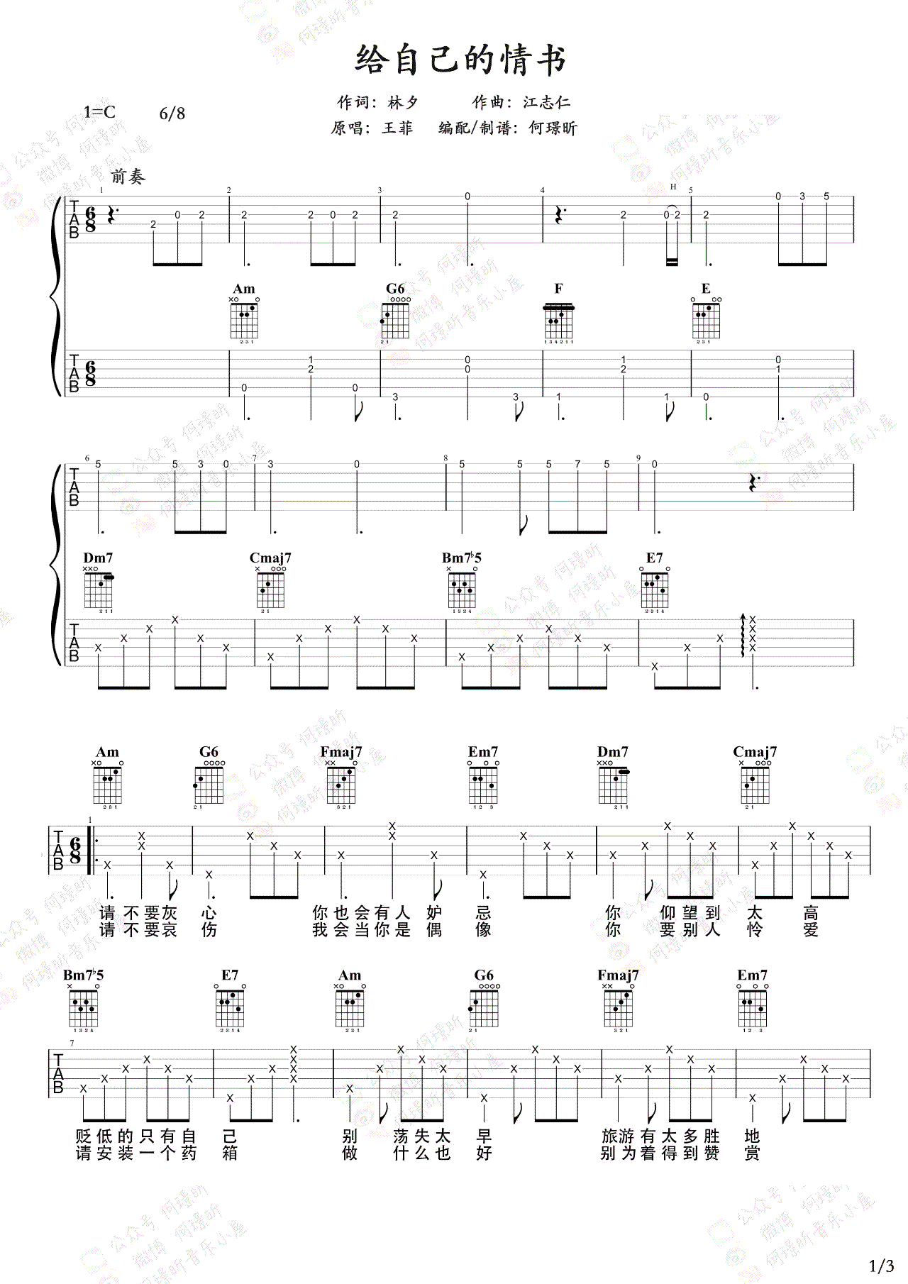 王菲《给自己的情书》吉他谱,C调指法,这首林夕填词的歌曲国语版是大家熟悉的《笑忘书》,爱别人之前,一定要先学会爱自己,这是很多人都很容易忽略的道理啊...