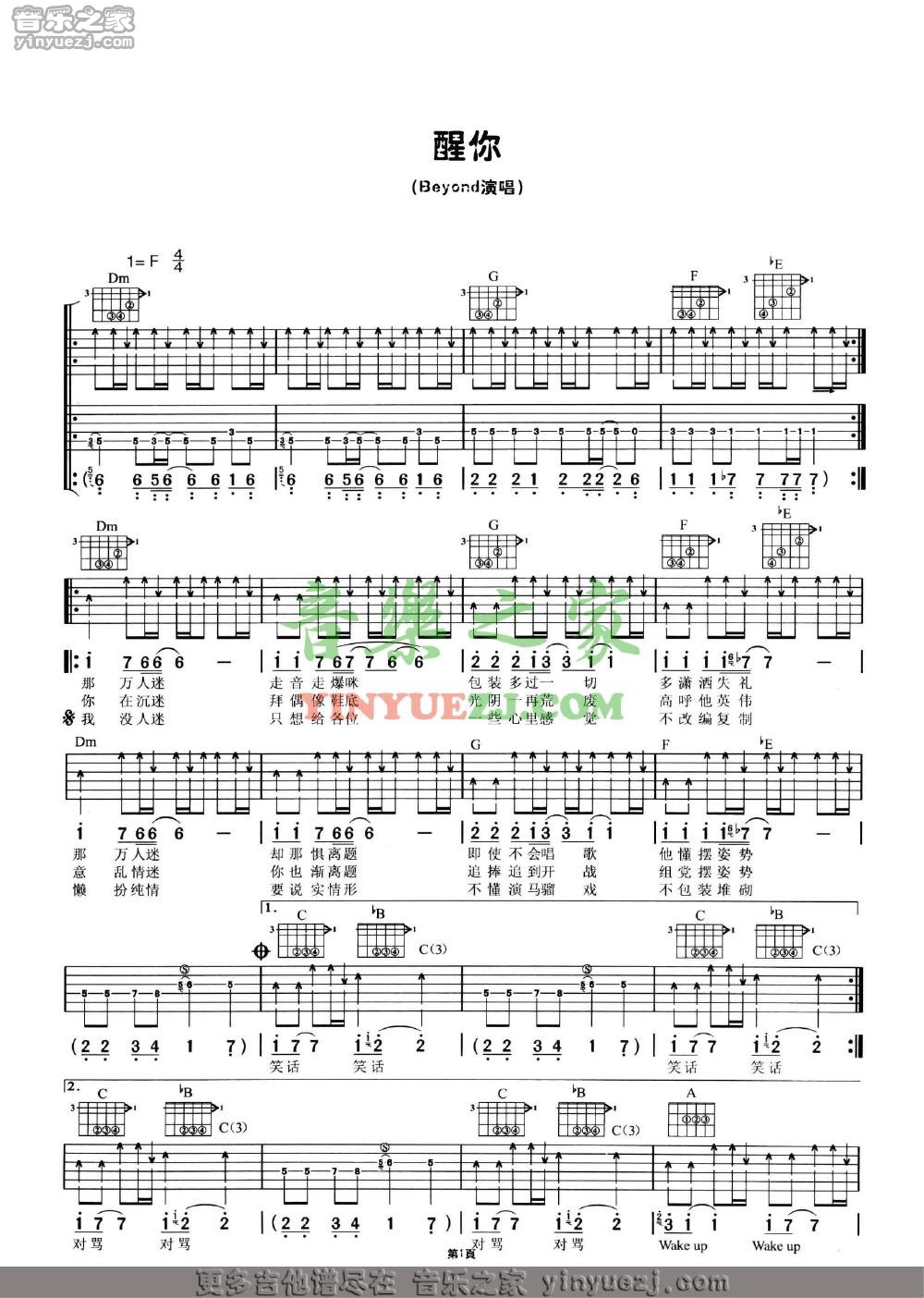 Beyond《醒你》吉他谱,YYZJ编配出品,共有2张高清图谱,免翻页排版设计。...