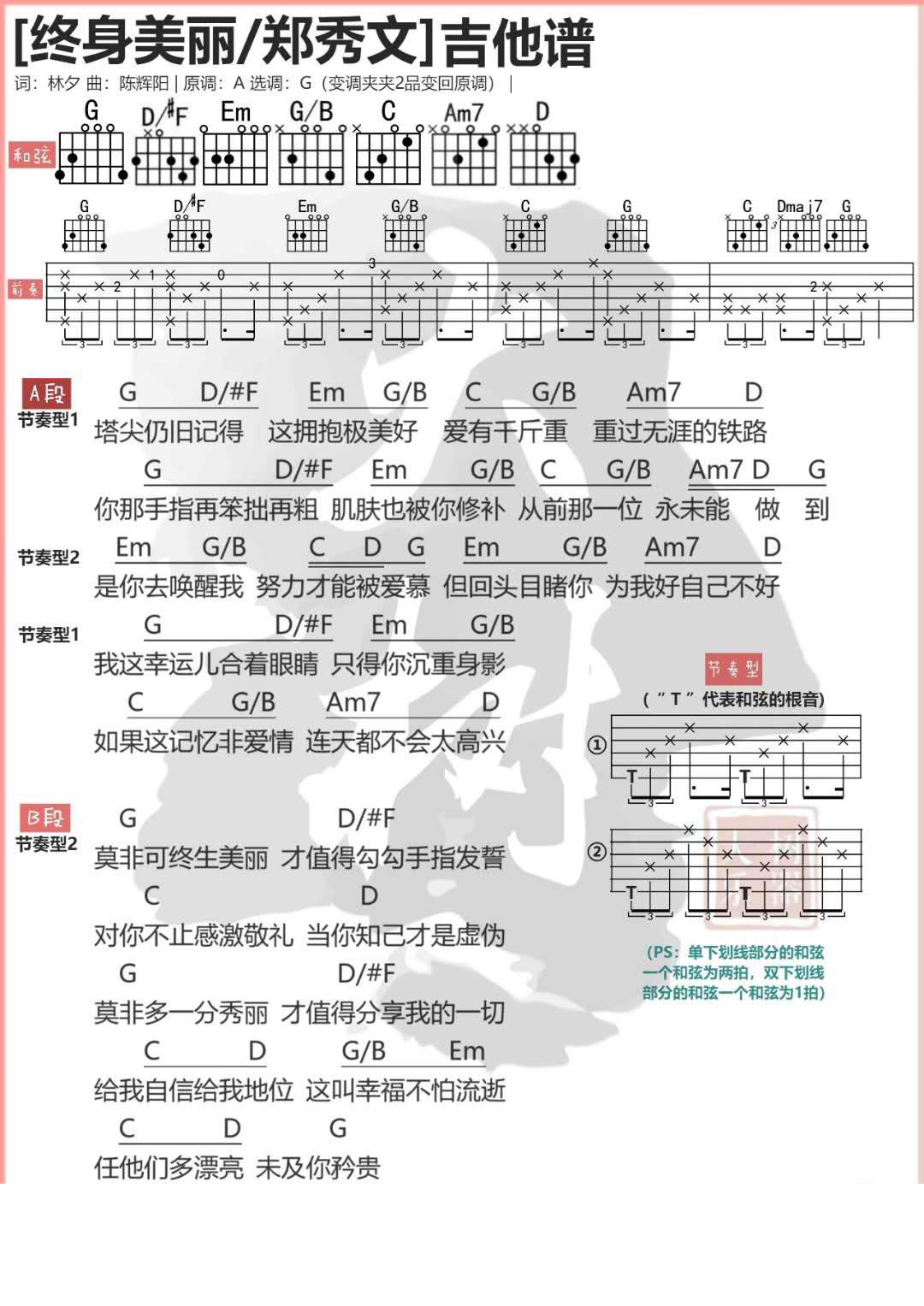 郑秀文《终身美丽》吉他谱,大树音乐屋编配出品,共有2张高清图谱,免翻页排版设计。...