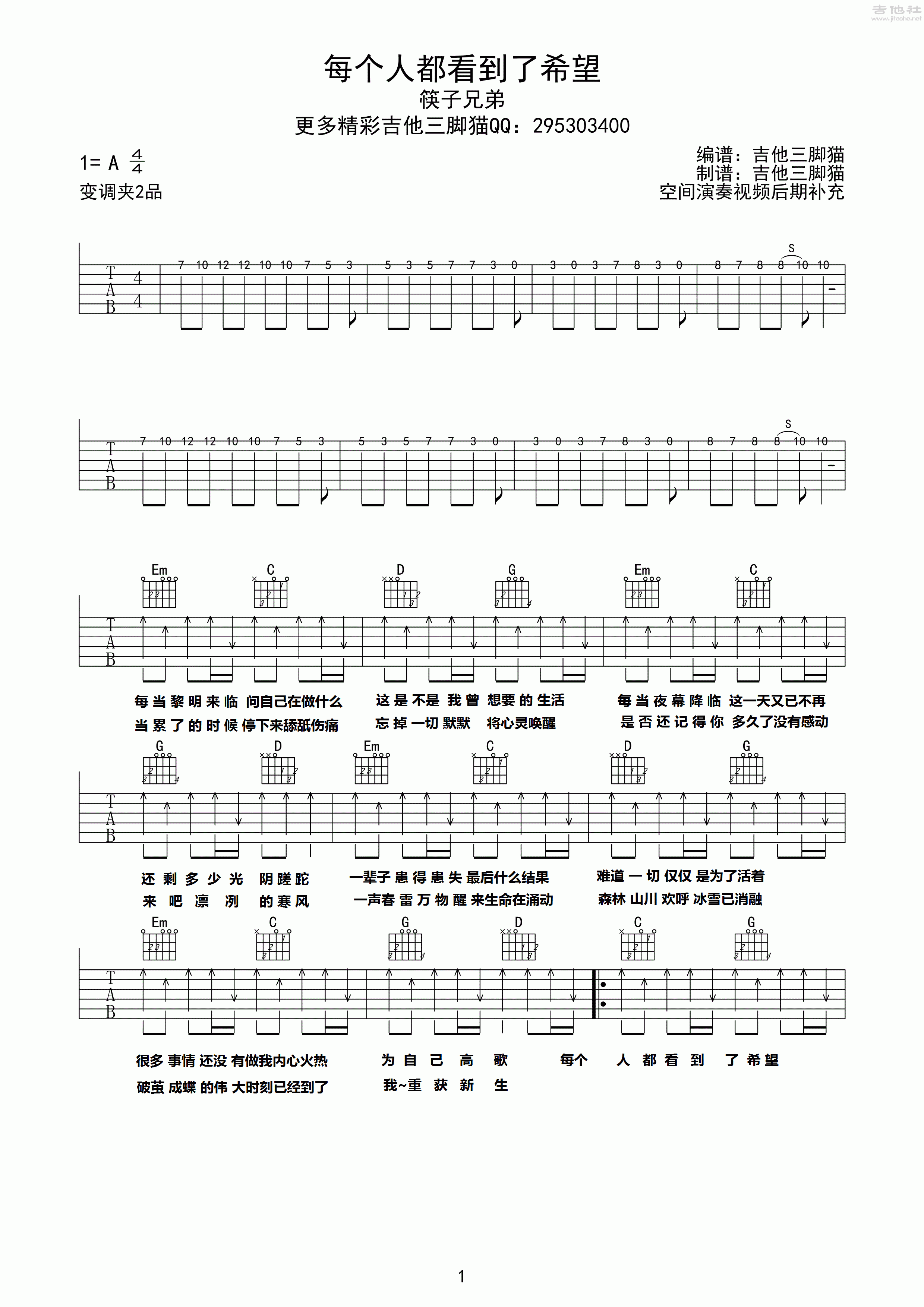 筷子兄弟《每个人都看到了希望》吉他谱,纵玩编配出品,共有2张高清图谱,免翻页排版设计。...