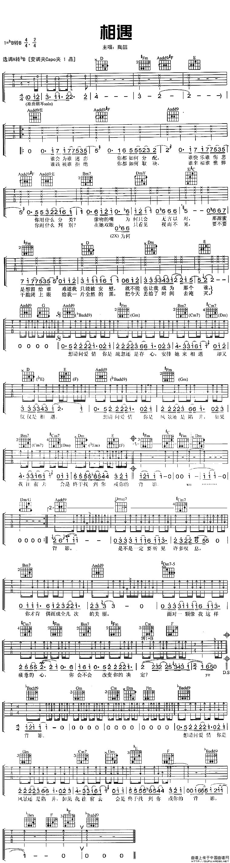 陶喆《相遇》吉他谱,共有1张高清图谱,免翻页排版设计。...
