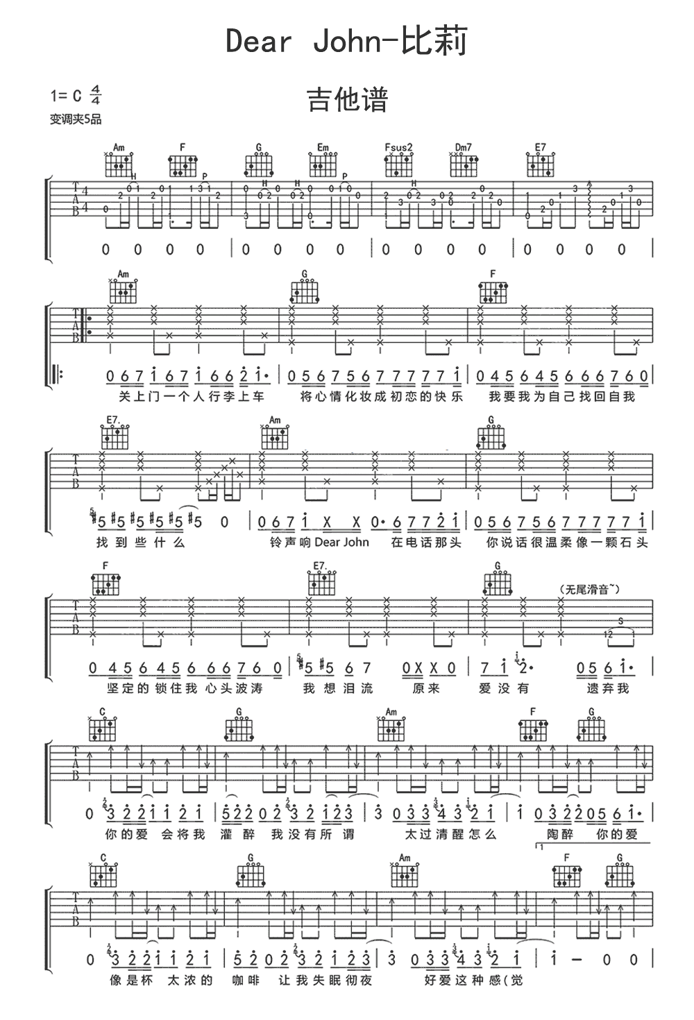 比莉的经典歌曲《DearJohn》吉他谱C调完整版。DearJohn歌曲的原调是F调的,男生用吉他谱弹唱建议变调夹夹0到5品,女生可以夹5品唱原调,具体的音高可以根据自己的嗓音调整....