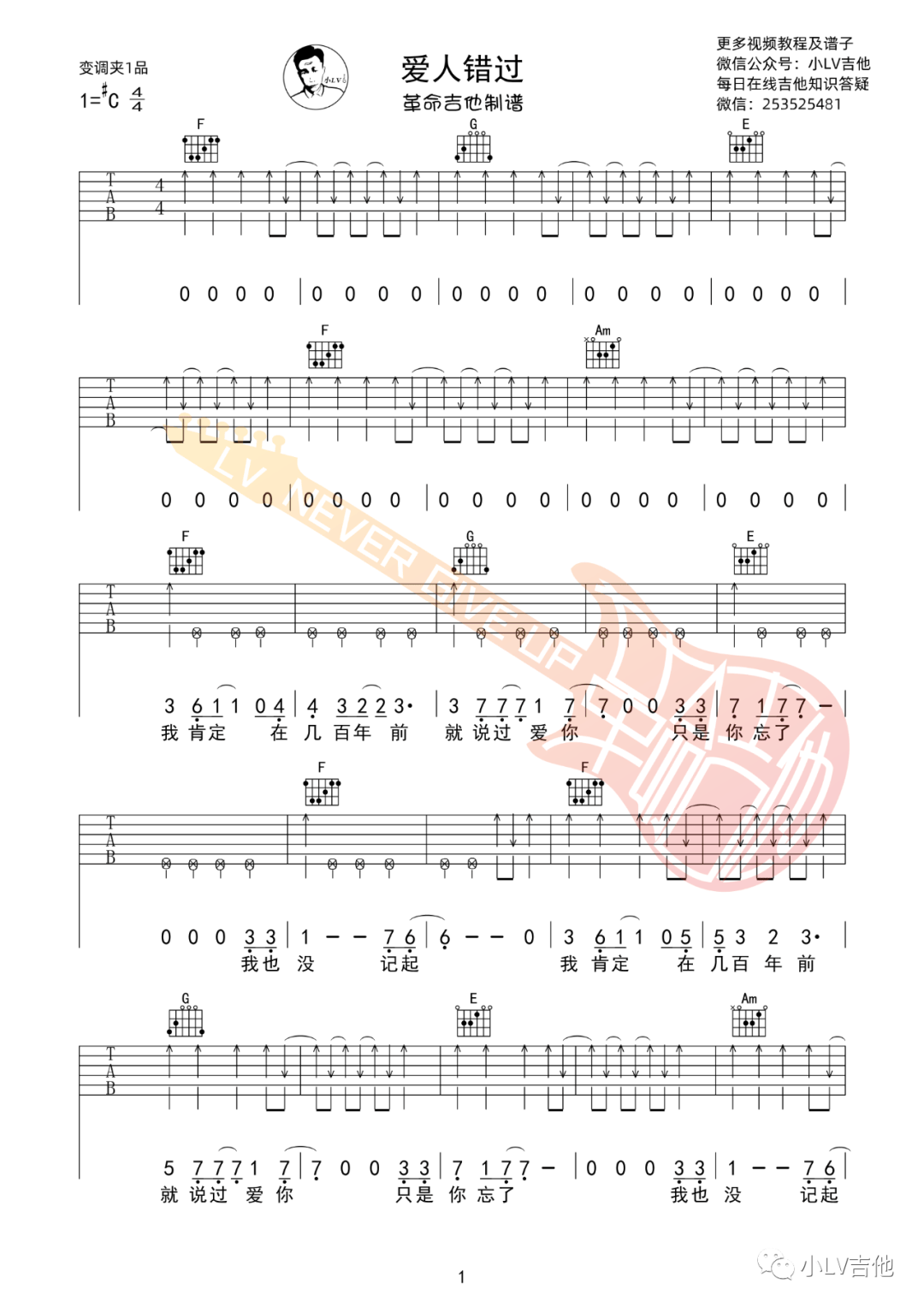 告五人《爱人错过》吉他谱,革命吉他编配出品,共有3张高清图谱。...