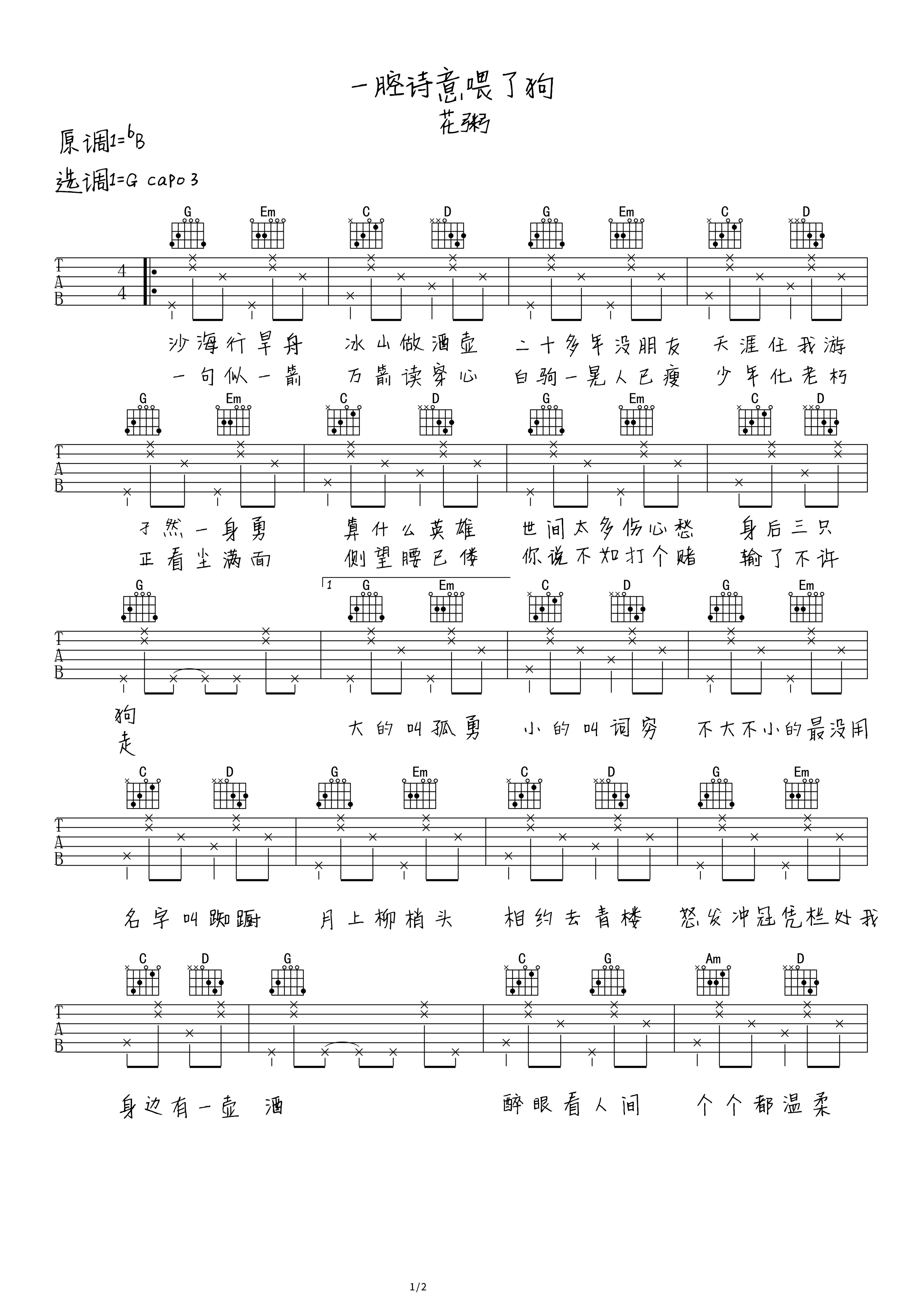 吉他花粥《一腔诗意喂了狗》吉他谱 - 免费版