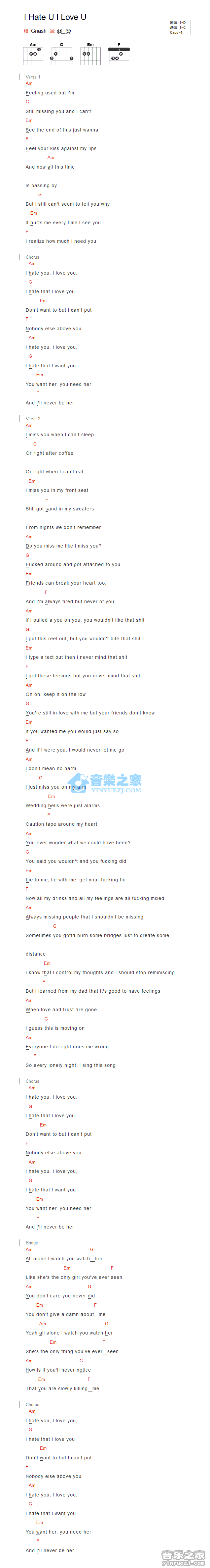 C调版Gnash《IHateUILoveU》吉他和弦弹唱谱...