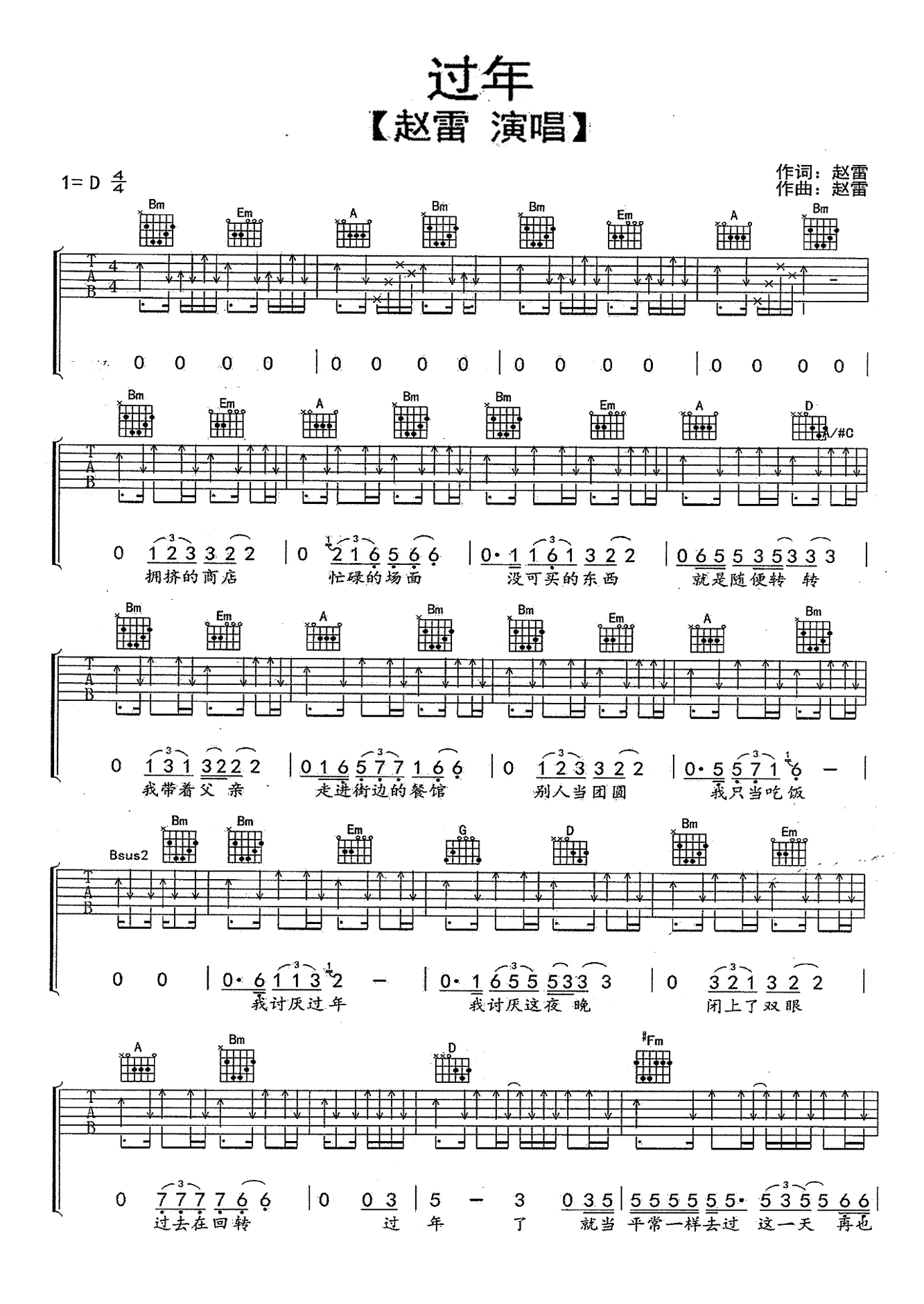 赵雷过年吉他谱,六线谱编配,变调夹夹第二品,一首心酸而忧伤的歌曲,热闹的鞭炮声崩不去穷也崩不出平安,再也不会像儿时一样期待这一天。过年吉他弹唱谱,赵雷作品吉他谱全集收录。...