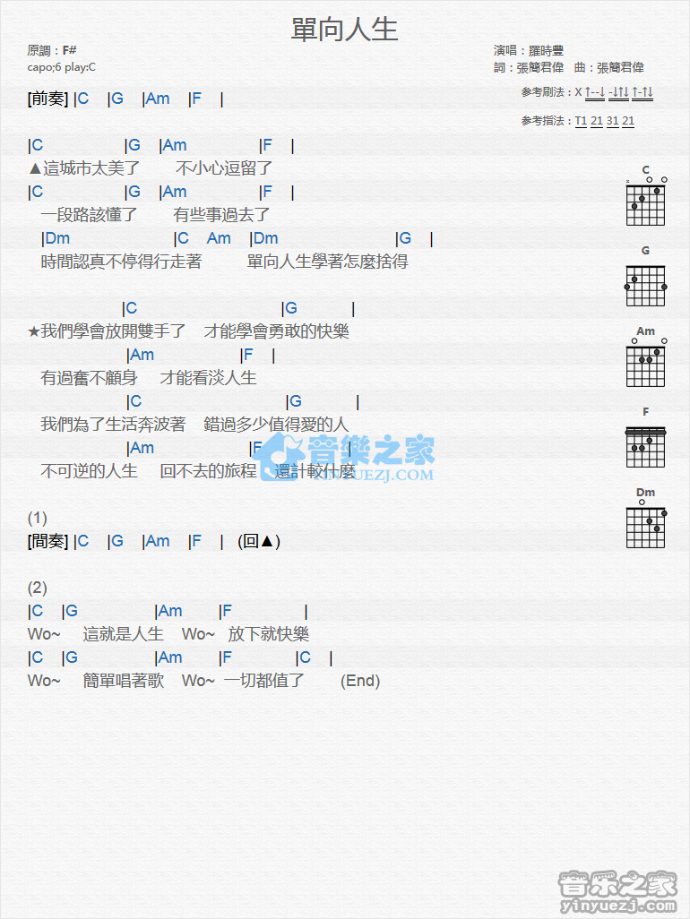C调版罗时丰《单向人生》吉他和弦弹唱谱...
