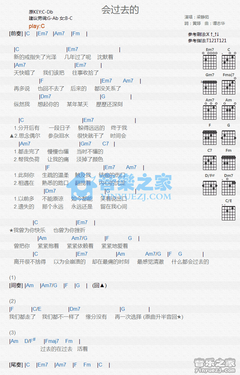 C调版梁静茹《会过去的》吉他和弦弹唱谱...