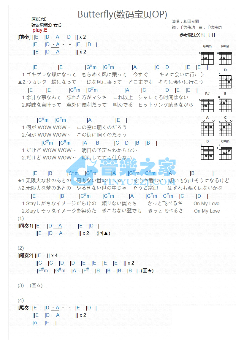吉他和田光司《Butterfly》吉他谱 - YYZJ编配