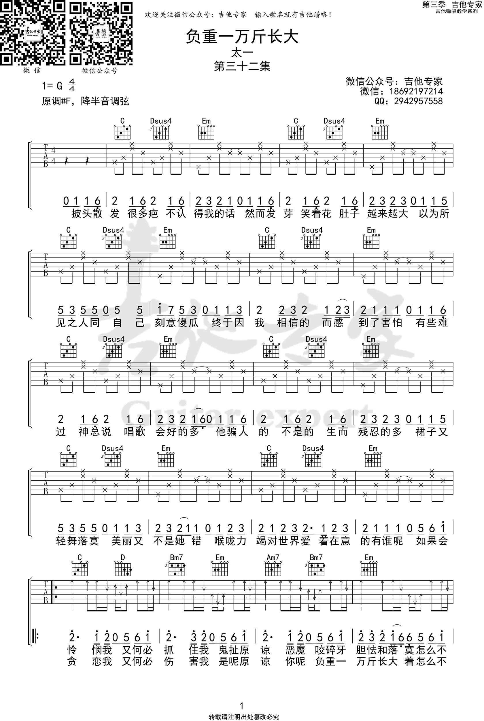 负重一万斤长大吉他谱,太一演唱,创作灵感据说来自于韩国电影《素媛》。负重一万斤长大吉他弹唱谱,G调降半音调弦,成长的过程一定是痛苦的,这是最基本的代价。成长总是需要面临责任和担当,并且无法拒绝。这个世界从来都没有那么美好,慢慢发现其实是一个很残酷的过程。所以,请带着对生活无比的热...