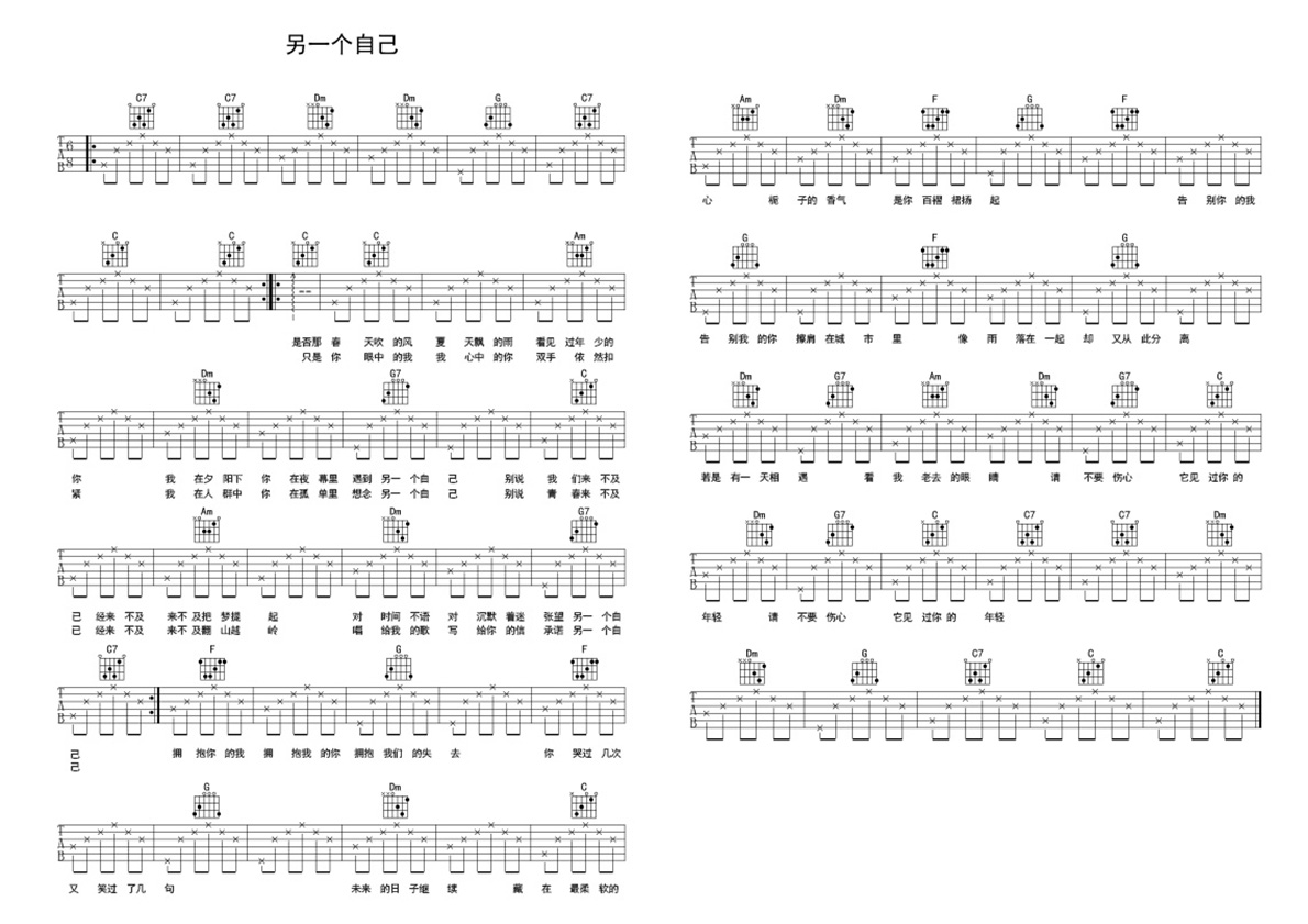 C调版《另一个自己》吉他弹唱六线谱...