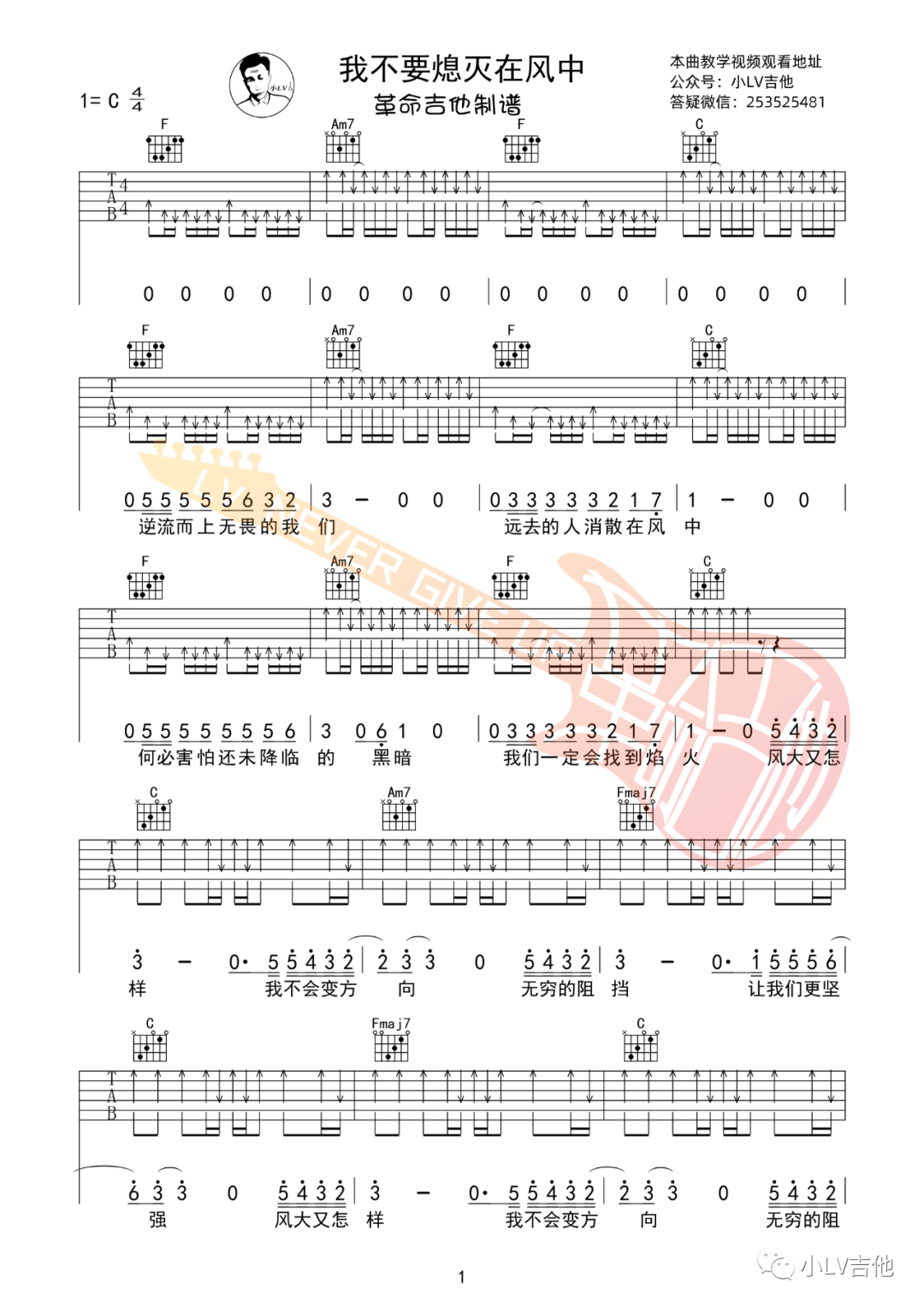 新裤子《我不要熄灭在风中》吉他谱,革命吉他编配出品,共有3张高清图谱。...