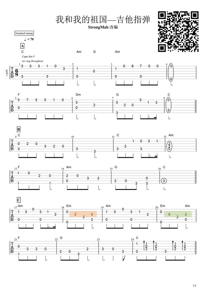 《我和我的祖国》吉他指弹欣赏,附吉他谱,本曲采用C调编配,变调夹第3品,对应了高低两个声部,难点在谱上做了高亮标记。...