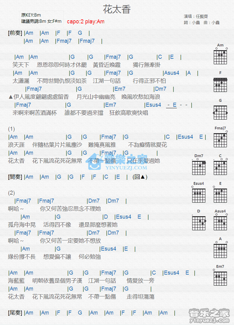 Am调版任贤齐《花太香》吉他和弦弹唱谱...