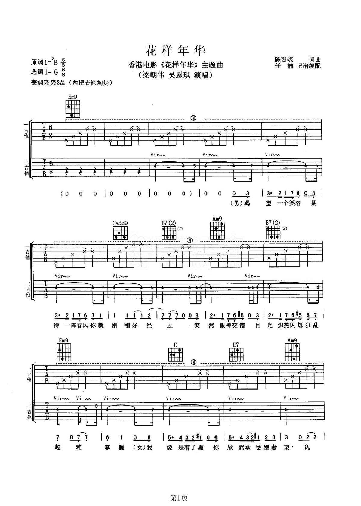 G调双吉他版梁朝伟/吴恩琪《花样年华》吉他弹唱六线谱...