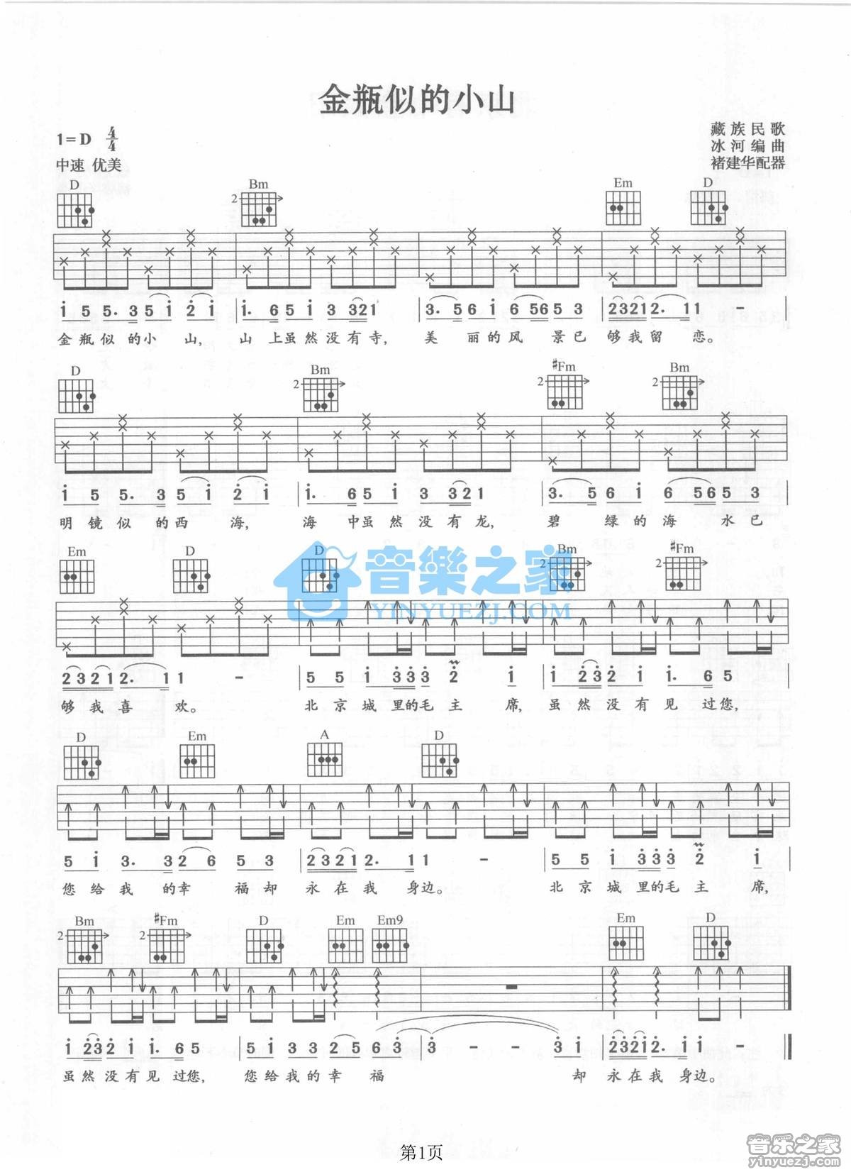 D调版藏族民歌《金瓶似的小山》吉他弹唱六线谱...