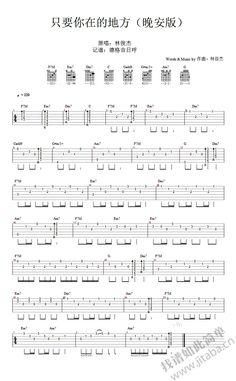 吉他林俊杰《只要有你的地方》吉他谱 - 非常多人都在弹的版本