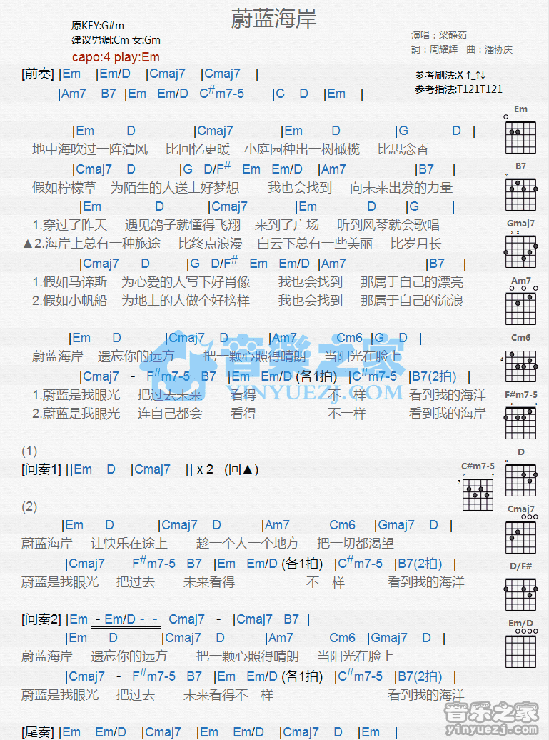Em调版梁静茹《蔚蓝海岸》吉他和弦弹唱谱...