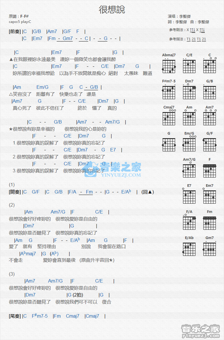 C调版李圣杰《很想说》吉他和弦弹唱谱...