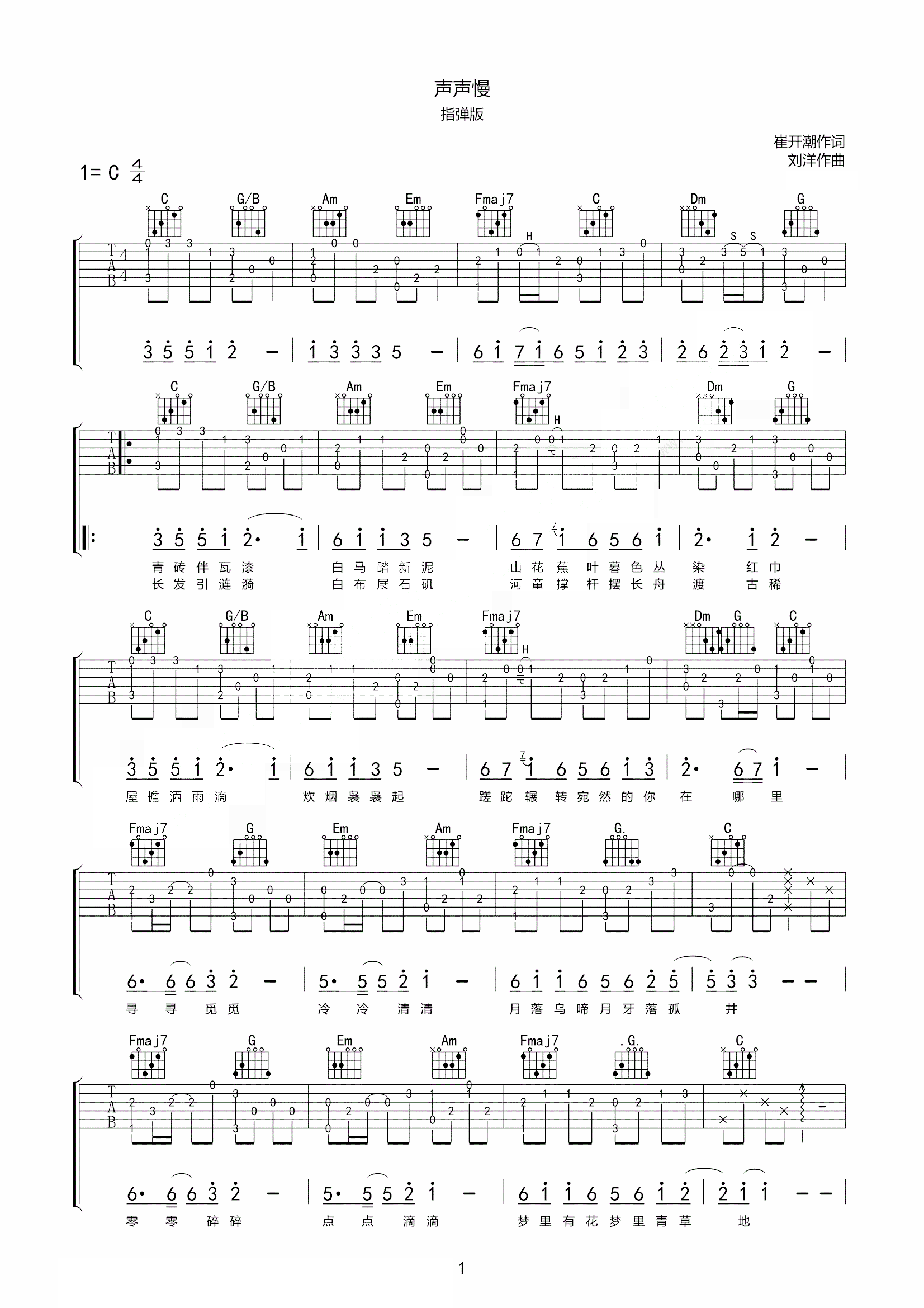 崔开潮《声声慢》吉他谱_C调吉他独奏谱...