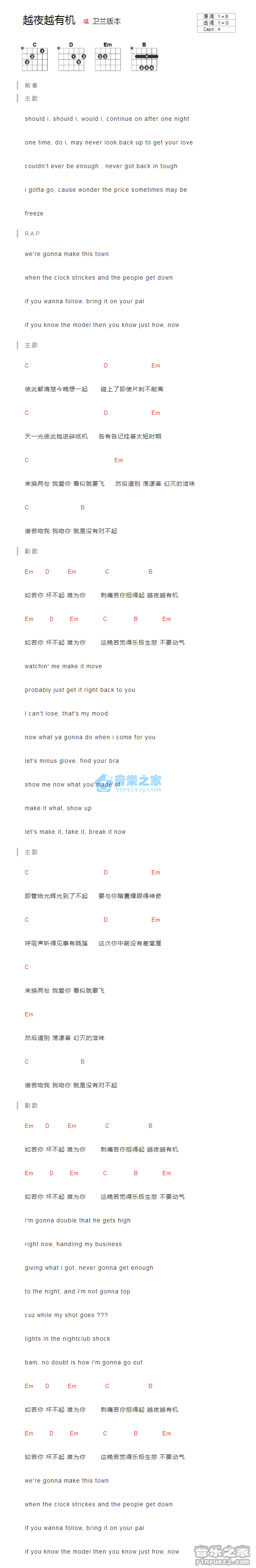 G调版卫兰《越夜越有机》吉他和弦弹唱谱...