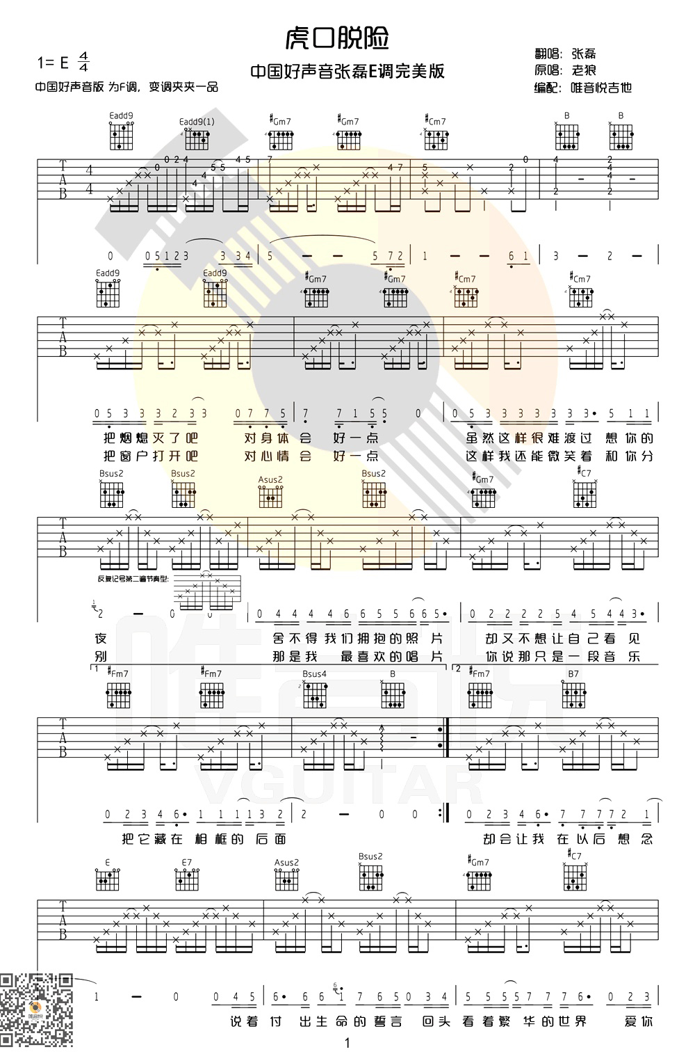 虎口脱险吉他谱,中国好声音张磊版本,虎口脱险吉他弹唱谱,E调完美六线谱图片,变调夹夹一品。这首歌曲原唱是老狼,张磊的音色极为暖心动听,翻唱真实而感人至深,有着不一样的风格。...