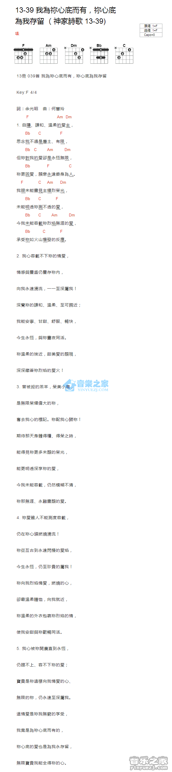 F调版13-39《我为你心底而有,你心底为我存留》吉他和弦弹唱谱...