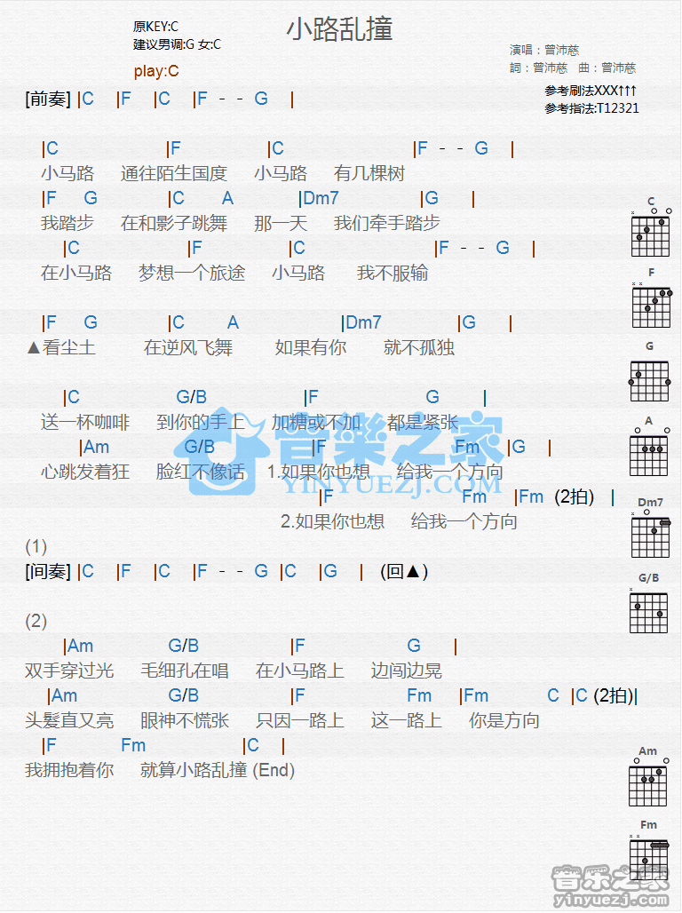 C调版曾沛慈《小鹿乱撞》吉他和弦弹唱谱...