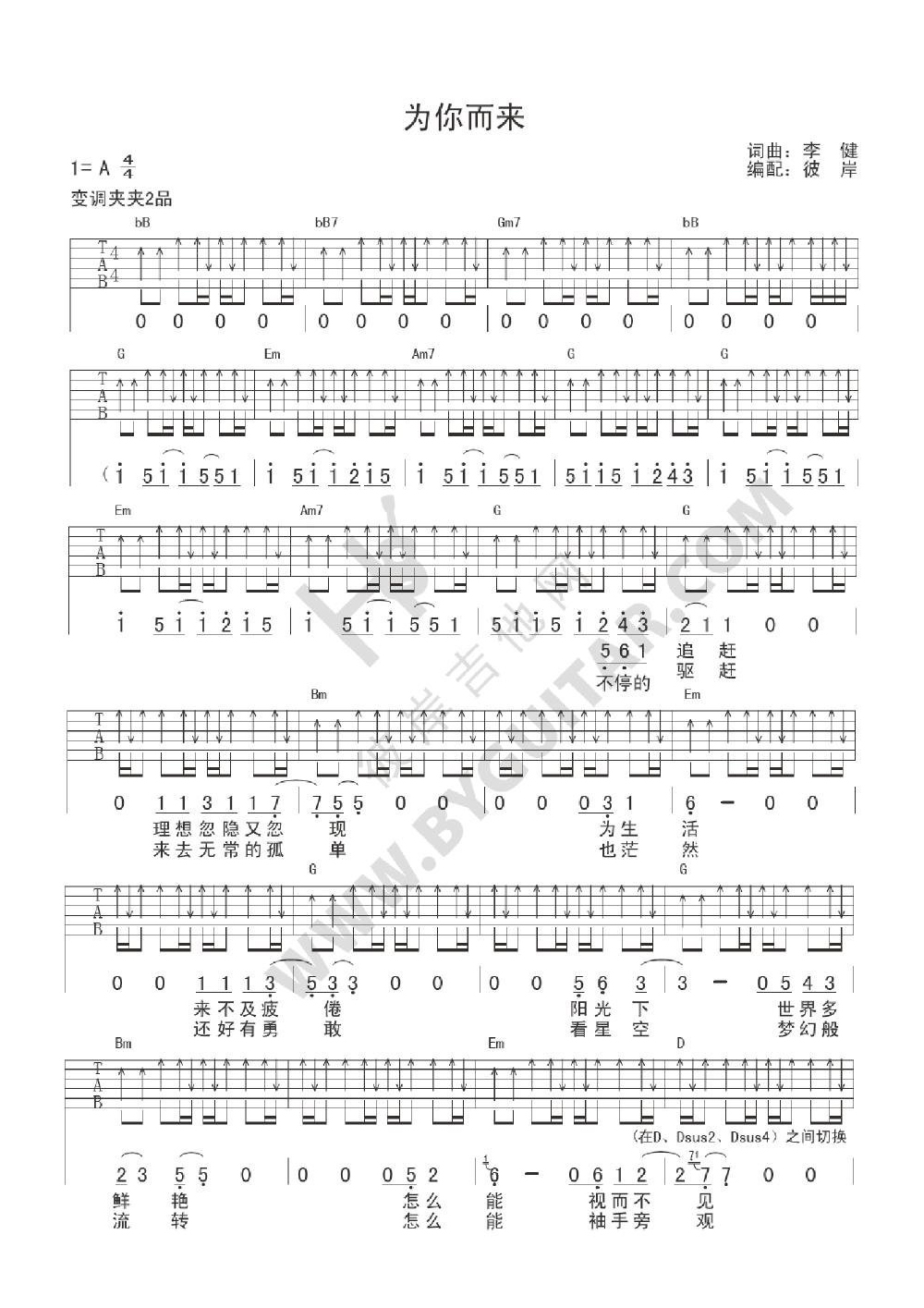 李健《为你而来》吉他谱,彼岸编配出品,共有2张高清图谱,免翻页排版设计。...