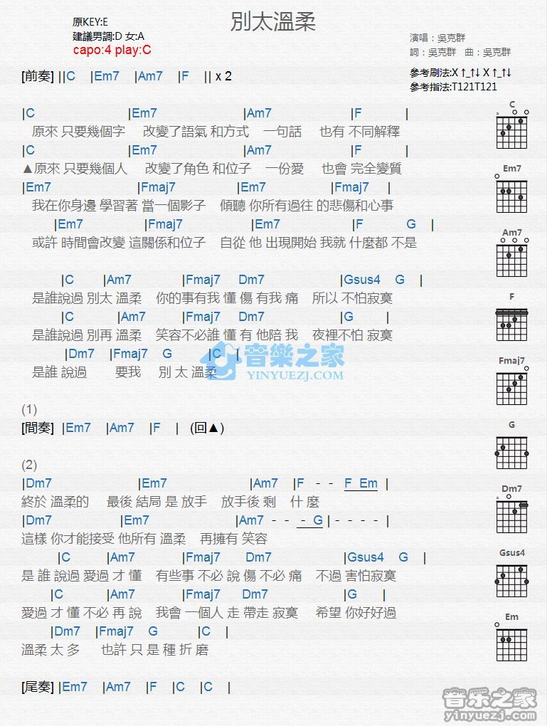 C调版吴克t《别太温柔》吉他和弦弹唱谱...