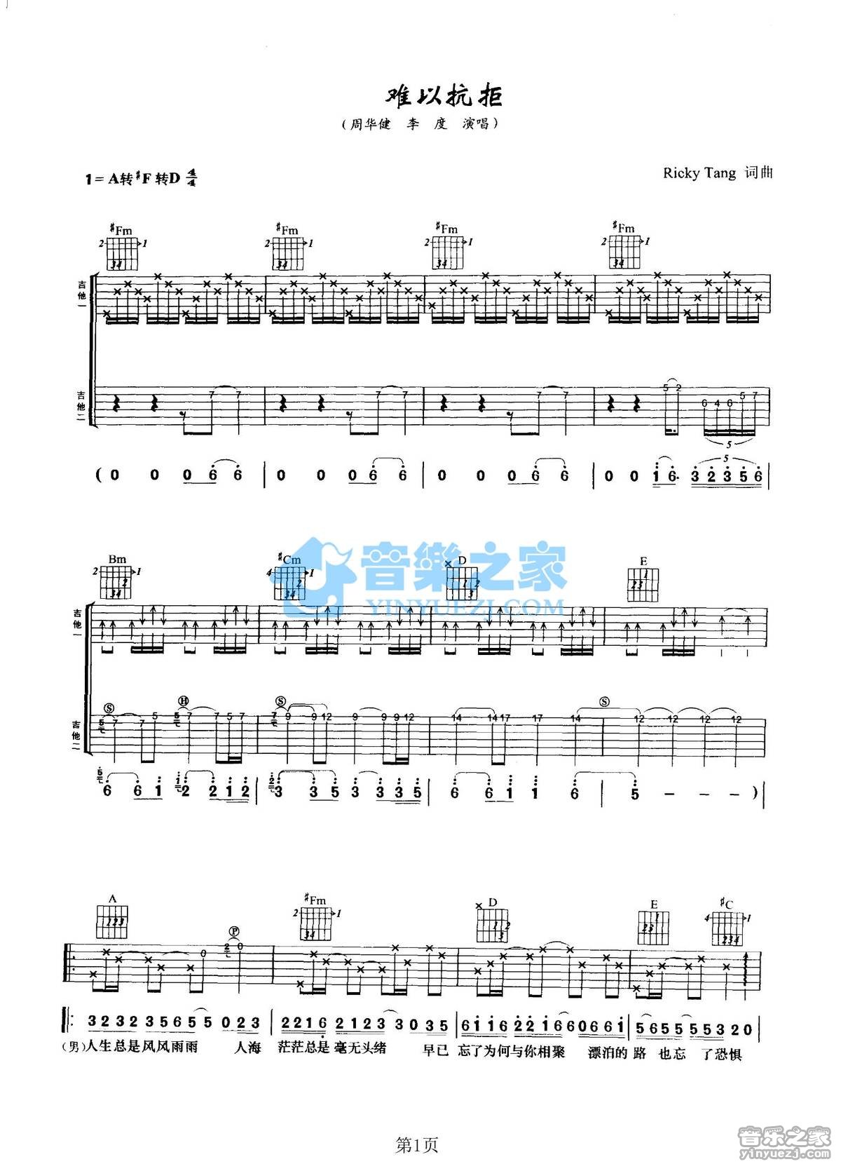 吉他周华健/李度《难以抗拒》吉他谱