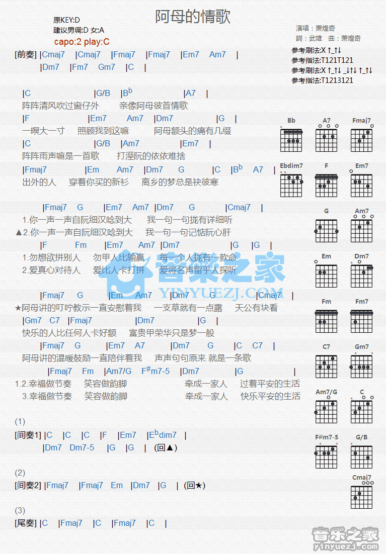 C调版萧煌奇《阿母的情歌》吉他和弦弹唱谱...