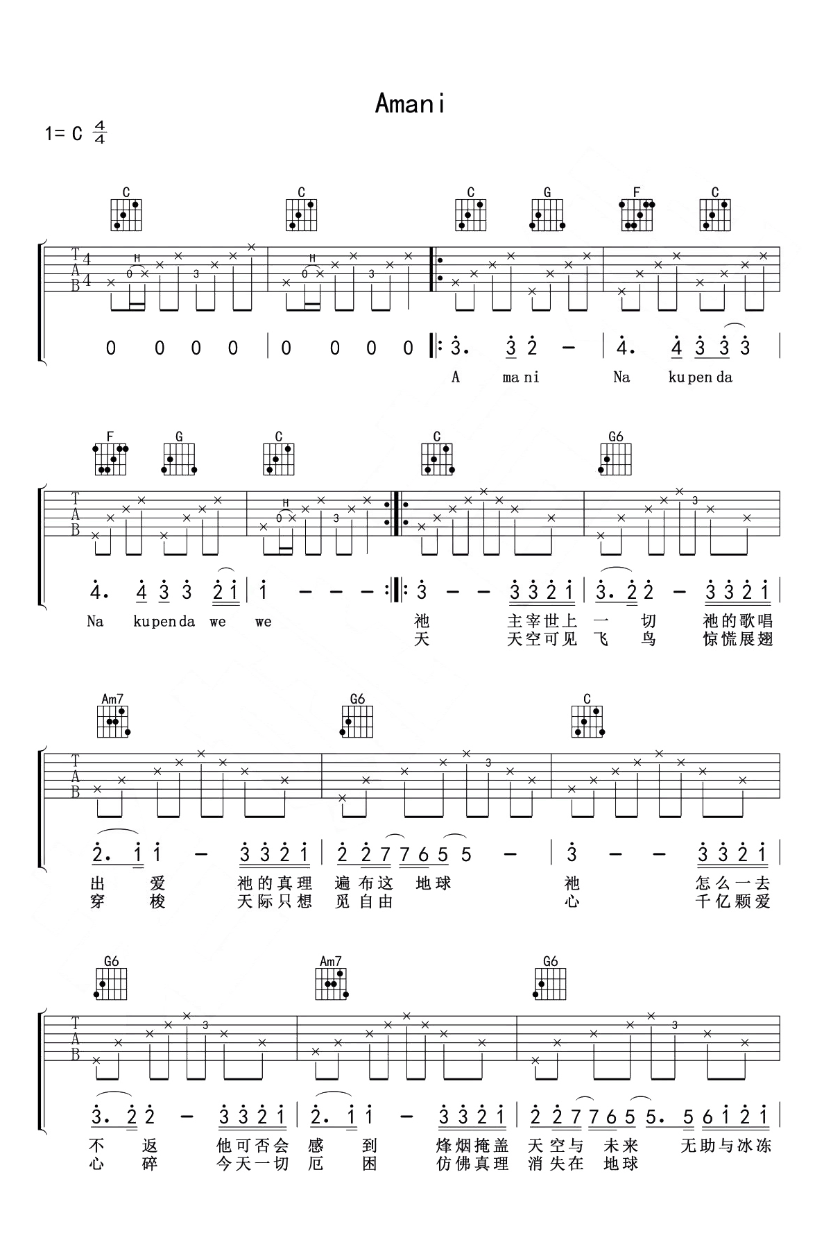 Amani吉他谱,Beyond演唱的一首感动无数国人的爱与和平的之歌,唱出对美好生活的向往。Amani吉他六线谱,C调弹唱谱,本期吉他基础教学配合Beyong的这首经典老歌,讲解击弦技巧、手指扫弦知识点,琴友们可以跟随老师的教学视频认真练习。...