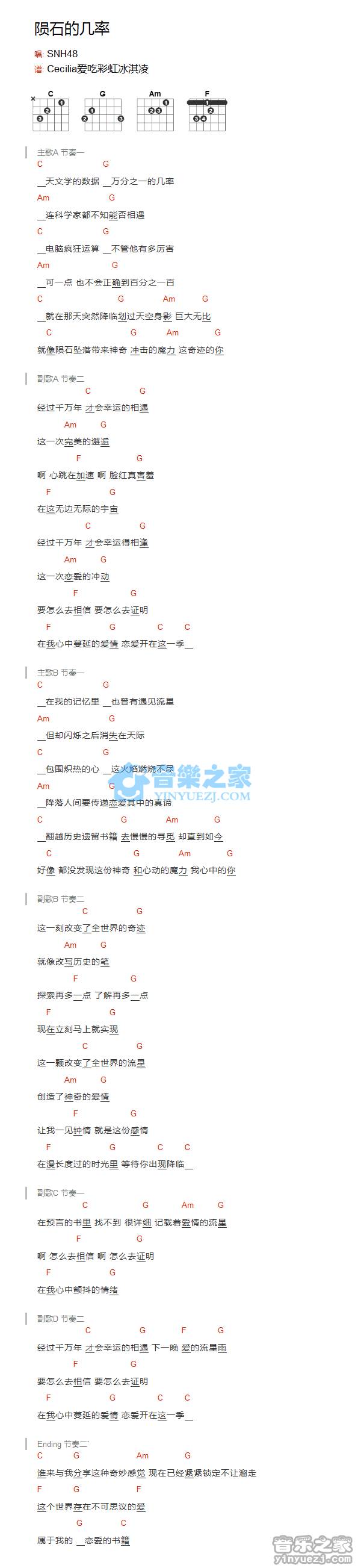吉他SNH48《陨石的机率》吉他谱 - 很多人都在弹的版本
