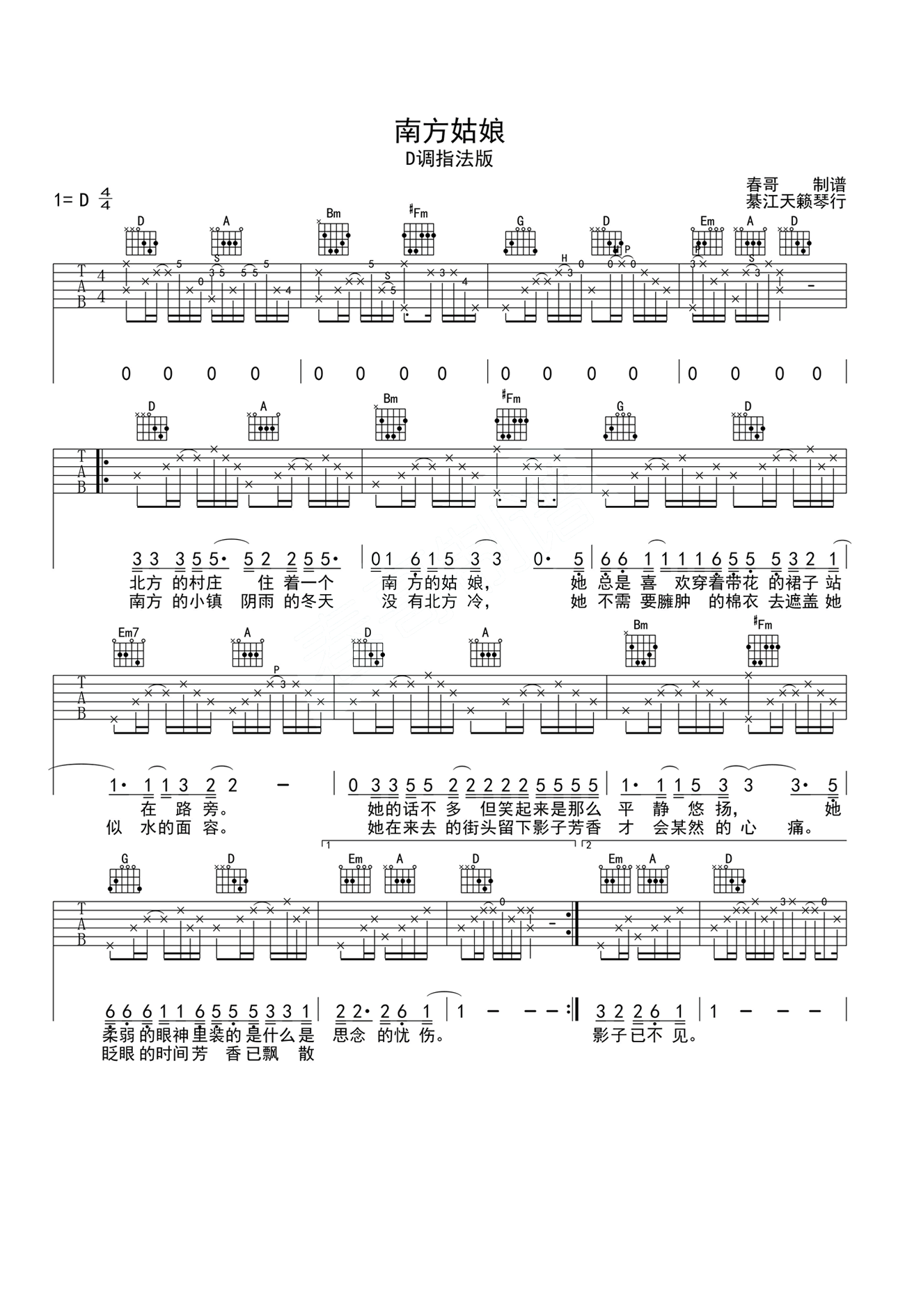 南方姑娘D调弹唱谱。北方的村庄,住着一个南方的姑娘,她总是喜欢穿着带花的裙子站在路旁。一首好听的民谣歌曲,柔情感动唱出的温暖感受,送给各位南来北往的小姑娘。吉他弹唱一首《南方姑娘》给她听,在四季的风中,她是不是也散着头发,安慰着你的时光。...