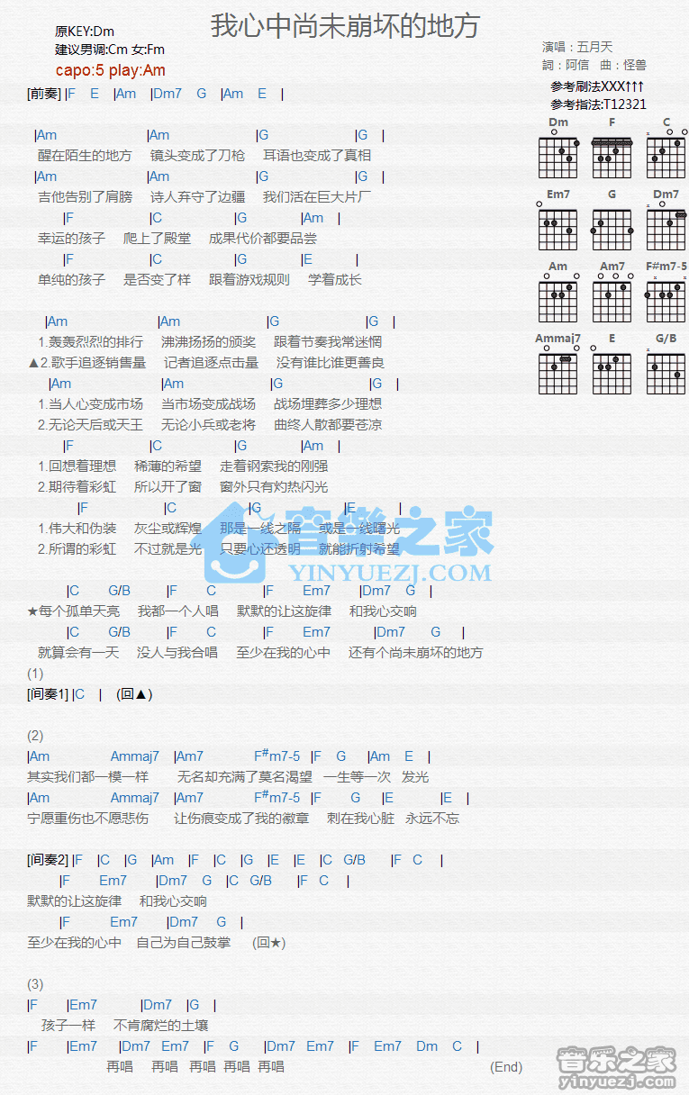 Am调版五月天《我心中尚未崩坏的地方》吉他和弦弹唱谱...