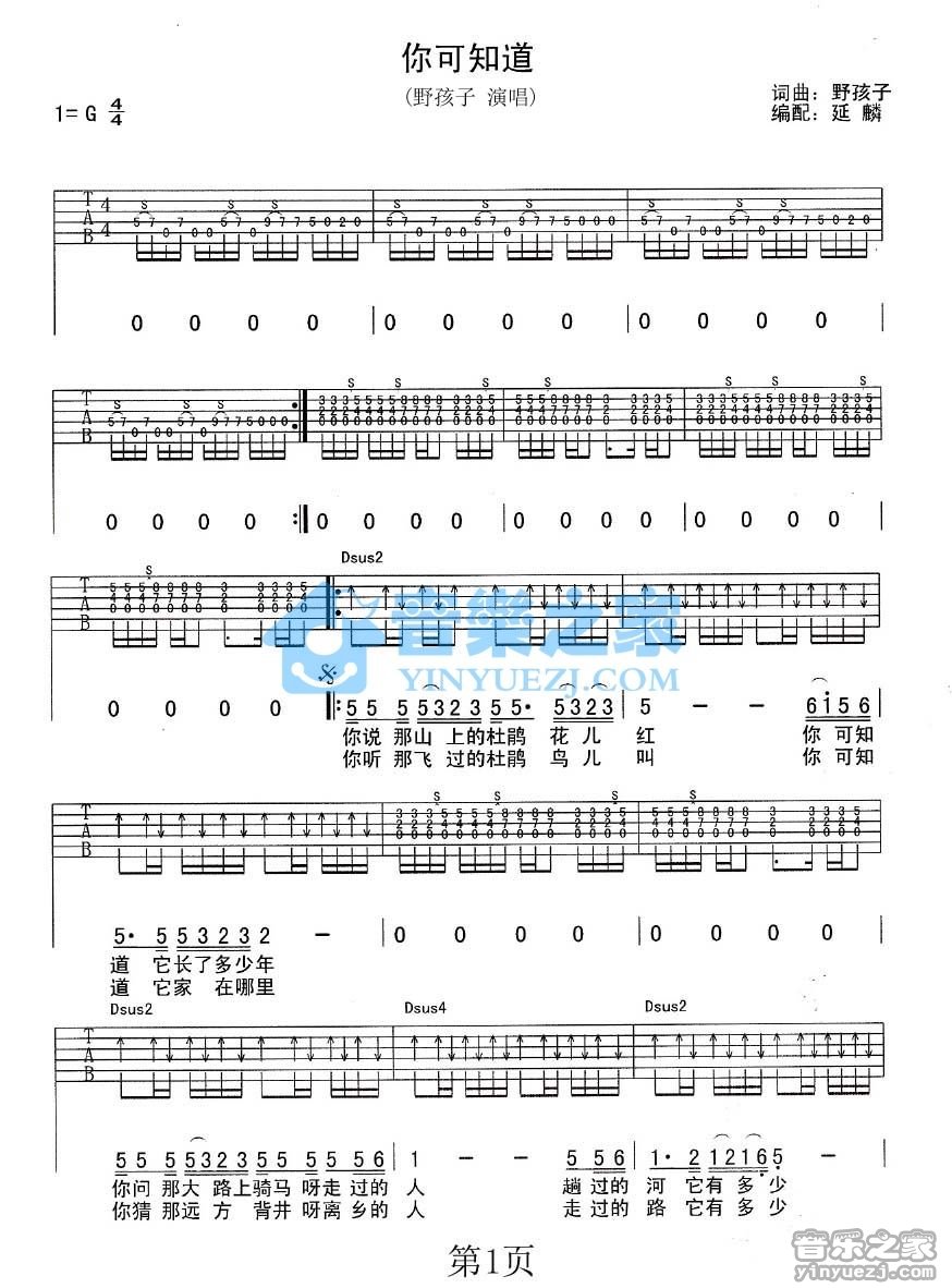 吉他野孩子《你可知道》吉他谱 - 免费版