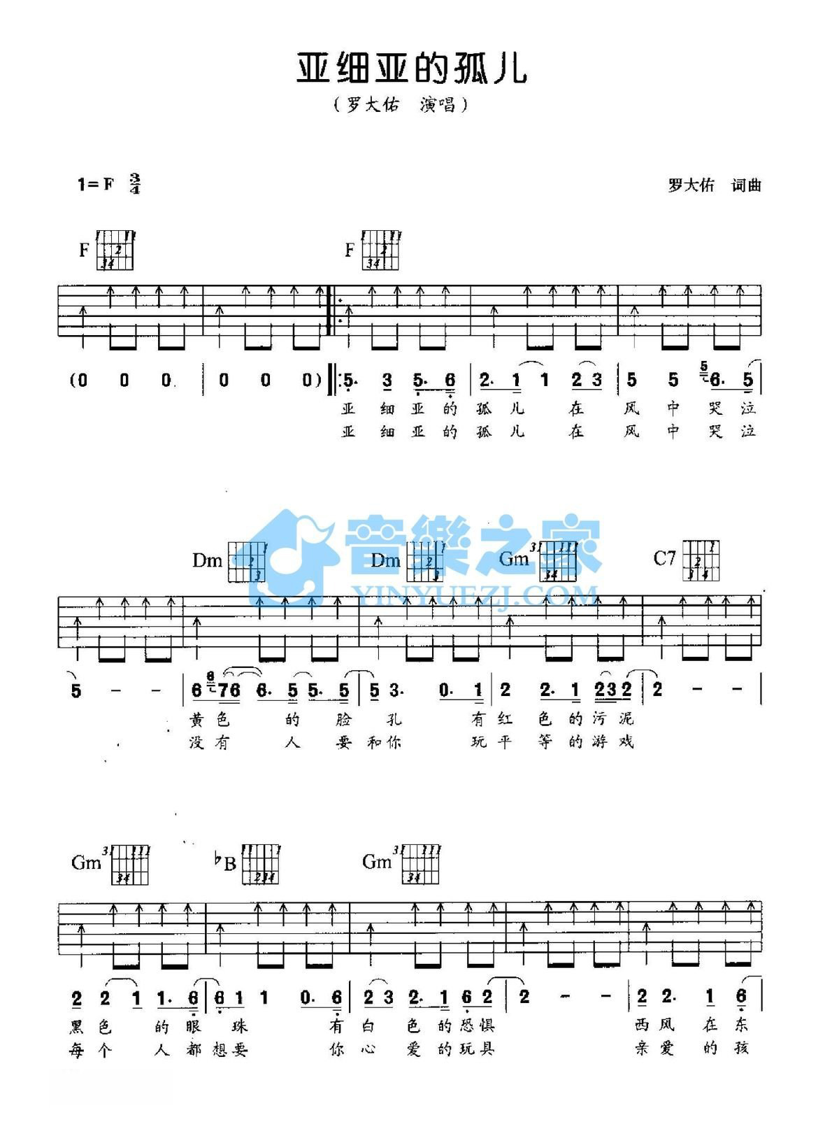 F调版罗大佑《亚细亚的孤儿》吉他弹唱六线谱...