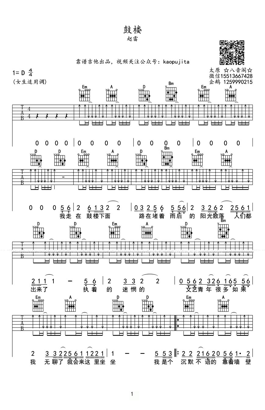 鼓楼吉他谱,赵雷词曲演唱的一首民谣歌曲,鼓楼吉他六线谱,D调编配,女生适用调。曲谱由靠谱吉他出品。词句朴实真诚,曲调悦耳。感觉在听一个故事!“我是个沉默不语的靠着墙壁晒太阳的过客,如果我有些倦意了,就让我在这里独自醒过……”赵雷的一曲《鼓楼》将他的北京情结娓娓道来。...