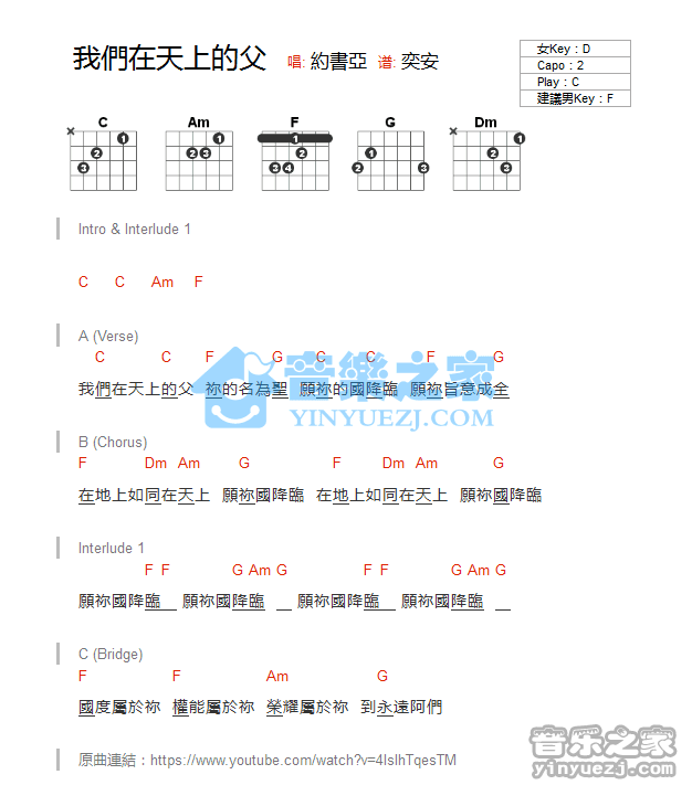 C调版约书亚《我们在天上的父》吉他和弦弹唱谱...