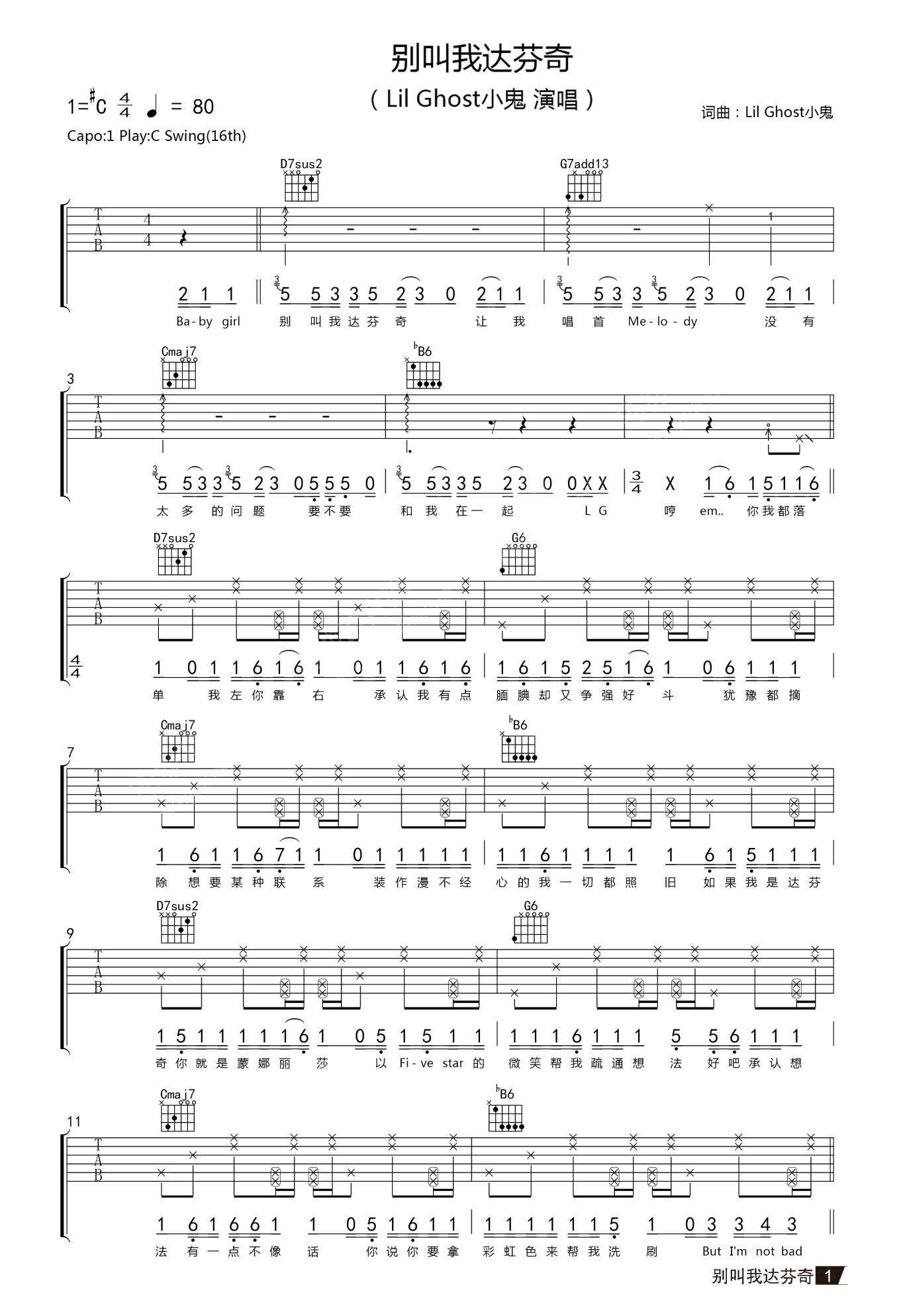 吉他Lil Ghost 小鬼《别叫我达芬奇》吉他谱 - 好听到爆炸
