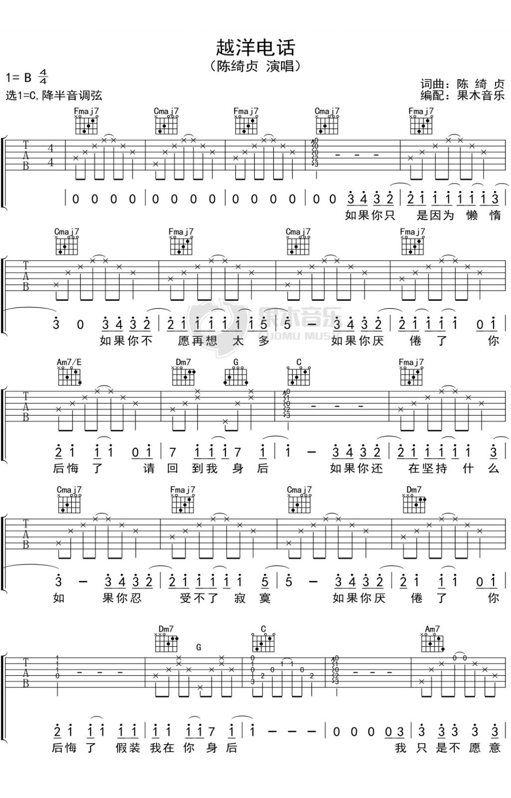 陈绮贞《越洋电话》吉他谱,果木音乐编配出品,共有2张高清图谱,免翻页排版设计。...
