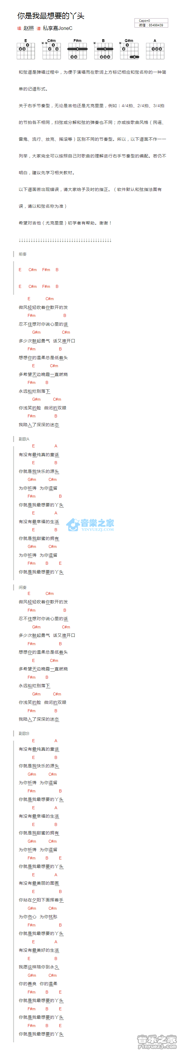 吉他赵照《你是我最想要的丫头》吉他谱 - YYZJ编配