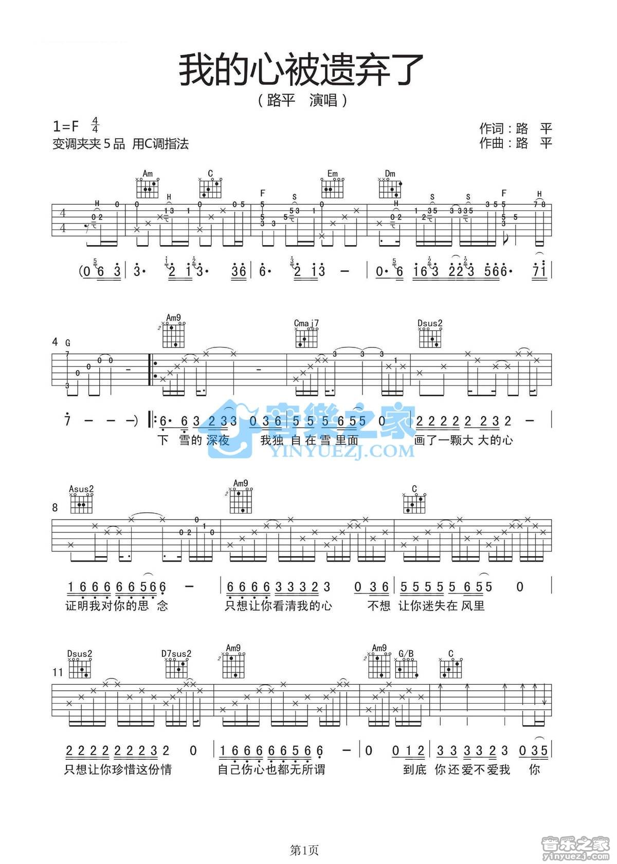 丽江酒吧C调原版路平《我的心被遗弃了》吉他弹唱六线谱...