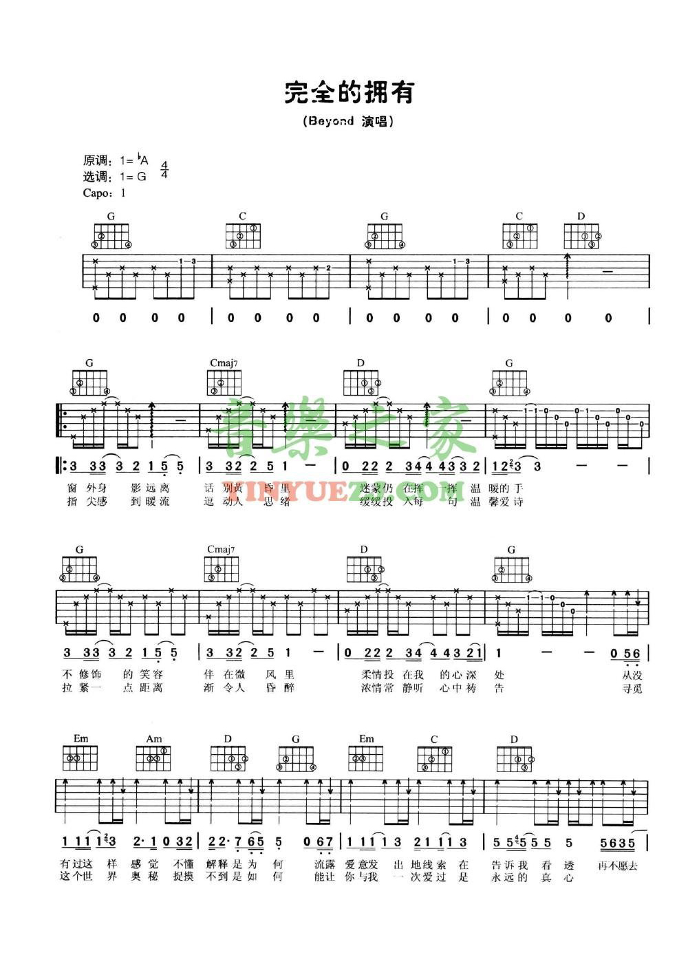 Beyond《完全的拥有》吉他谱,YYZJ编配出品,共有2张高清图谱,免翻页排版设计。...