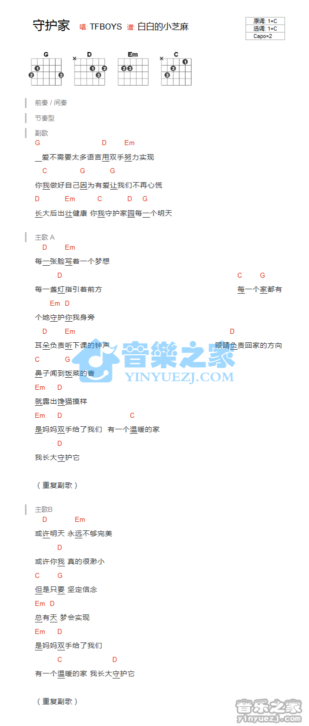 TFboys《守护家》吉他谱,YYZJ编配出品,共有1张高清图谱,免翻页排版设计。...