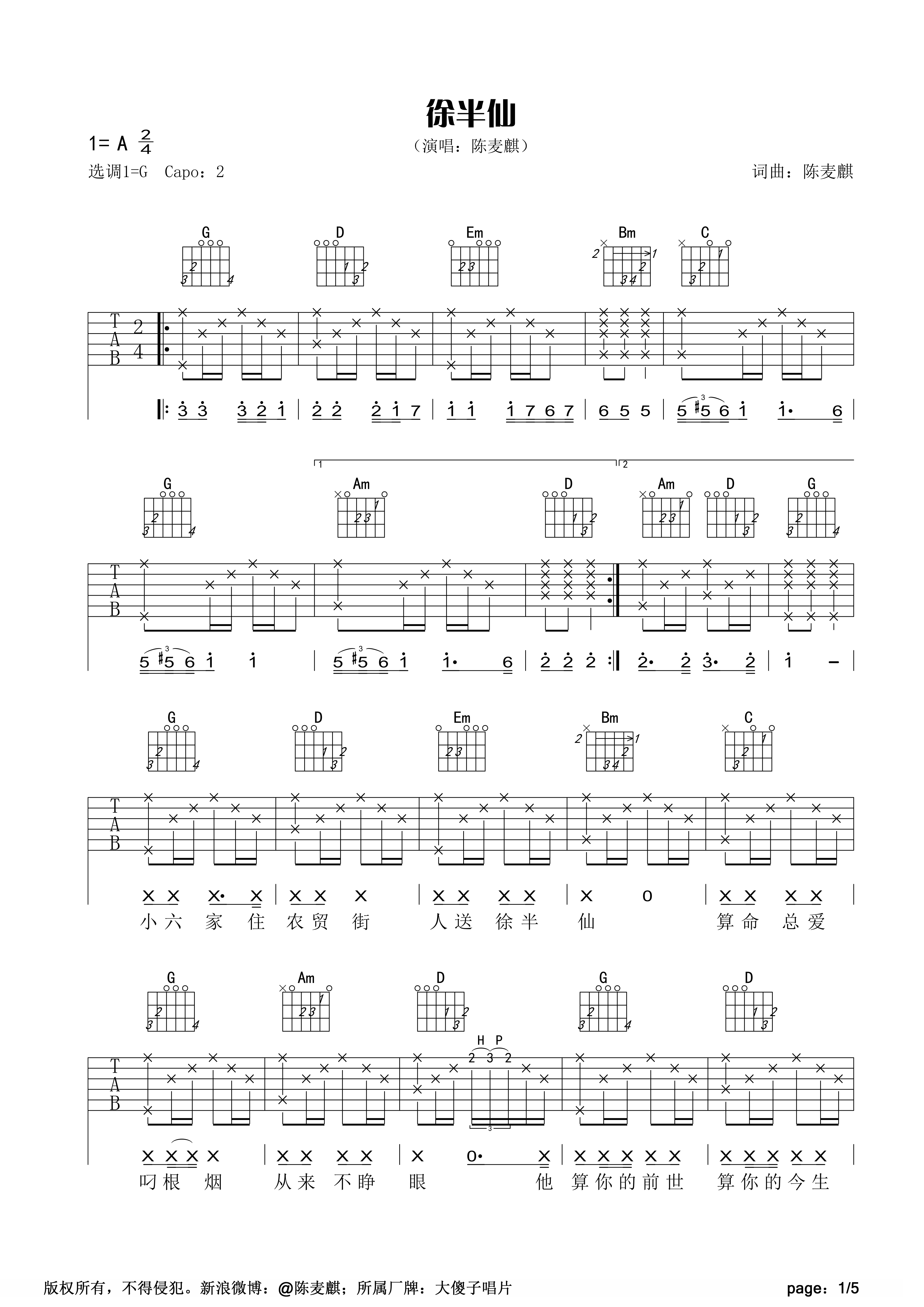 G调原版陈麦麒《徐半仙》吉他弹唱六线谱...
