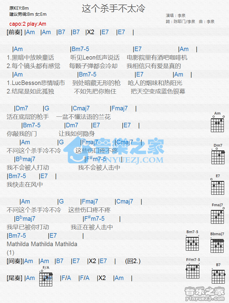 Am调版李泉《这个杀手不太冷》吉他和弦弹唱谱...